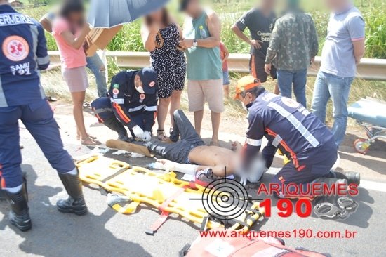 Por volta das 12 horas deste sábado (28/05), a equipe do Serviço de Atendimento Móvel de Urgência (SAMU) foi acionada a comparecer na BR-364, pois segundo informações havia ocorrido um acidente de trânsito. Quando os socorristas chegaram ao local se depararam com a vítima ao solo apresentando alguns ferimentos. De imediato os socorristas prestaram os primeiros socorros, utilizando o colar cervical e imobilizando a vítima. Após o Atendimento Pré-Hospitalar (APH) prestado à vítima pelo SAMU, a mesma foi encaminhada para o Pronto Socorro do Hospital Regional de Ariquemes. Segundo informações levantadas ao local, o motociclista estava transitando pela BR-364, momento em que ao realizar uma curva não conseguiu frear a tempo vindo a colidir sua motocicleta da marca Honda de cor preta na traseira de uma ambulância. A Polícia Rodoviária Federal foi acionada e compareceu ao local onde esteve realizando os trabalhos de praxe. A vítima apresentava uma possível fratura na perna e um corte na cabeça.
