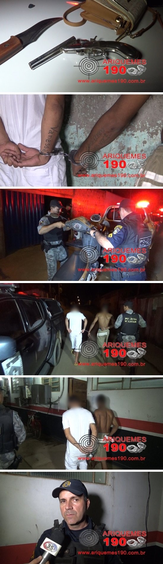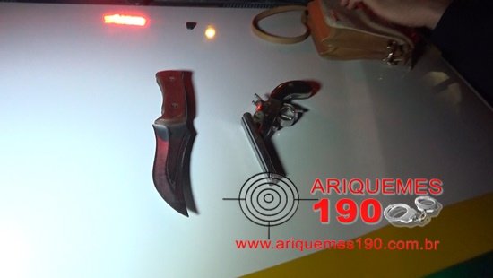 Por volta das 18h30min de domingo (29/05), os Cabos Monteiro e Freire e o PM Rafael Fonseca, realizavam patrulhamento de rotina pelas ruas da cidade, quando avistaram um indivíduo conduzindo uma motocicleta de cor amarela com as mesmas características de uma moto que tinha sido roubada no último dia 28 de maio de 2016. A guarnição acompanhou o sujeito até a Rua Alto Paraíso, no Setor Apoio Social, onde fizeram a abordagem no condutor C.D.S. de 20 anos, tentando entrar em uma residência. Quando os Policiais entraram na casa, localizaram o suspeito J.P.J. de 20 anos, uma faca com cabo avermelhado e uma arma de fogo do tipo Garrucha de calibre 32 mm, além de vários documentos como Cartões de Banco, CPFs e Títulos de Eleitor. A moto Traxx Yes de placa NBR-3704/Ariquemes possuía restrição de Roubo/Furto, conforme ocorrência nº 1640/16, registrada na Delegacia de Patrimônio. Na residência foi encontrado o CRLV de uma moto, sendo que o documento foi roubado no dia 20 de maio de 2016 (sexta-feira), conforme ocorrência nº 4848/16, registrada na Delegacia Geral. Os Policiais constataram que na manhã de domingo (29/05), aconteceu um roubo onde foi utilizada uma moto com as mesmas características da motocicleta apreendida e o marginal utilizou uma faca com cabo avermelhado. Mediante os fatos a dupla recebeu Voz de Prisão e foi apresentada na Delegacia Geral, onde foi registrada a ocorrência nº 5107/16, para as providências que o caso requer.