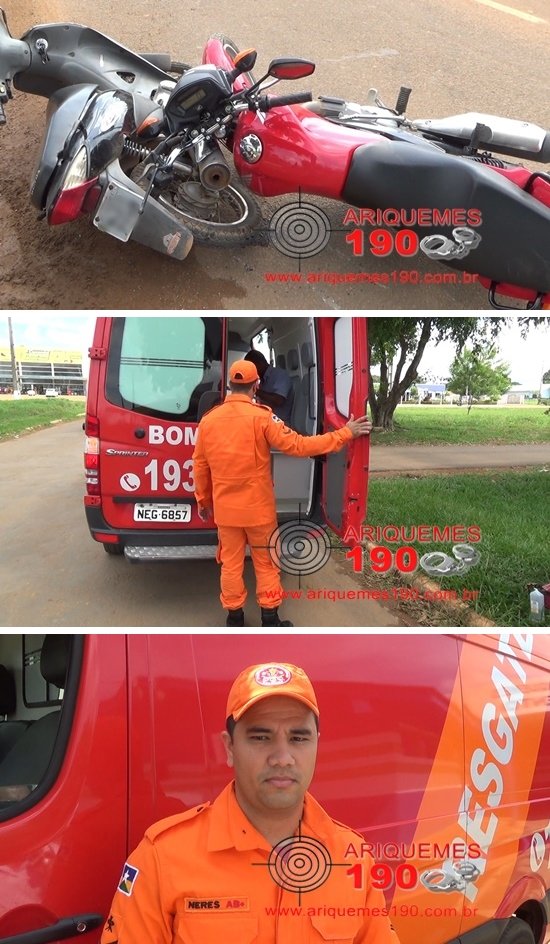 Por volta das 13 horas desta terça-feira (31/05), o Corpo de Bombeiros foi acionado a comparecer na Av. Capitão Silvio em Ariquemes, pois segundo informações havia ocorrido um acidente de trânsito. Logo que os Bombeiros chegaram até o local se depararam com duas vítimas. De imediato foram prestaram os primeiros socorros às vítimas e encaminhou uma delas ao Hospital Regional de Ariquemes para receber atendimento médico especializado. Segundo informações levantadas no local, um dos condutores estava transitando na Avenida Capitão Silvio, momento em que veio colidir com o outro veículo que saia de um Auto Posto. O acidente envolveu uma motoneta da marca Honda modelo Biz 125 de cor preta e uma motocicleta da marca Honda modelo CG Titan de cor vermelha. Em entrevista concedida ao Canal 35 e Site Ariquemes 190 o Cabo Neres relatou que uma das vítimas apresentava uma fratura exposta no dedo anelar da mão esquerda.
