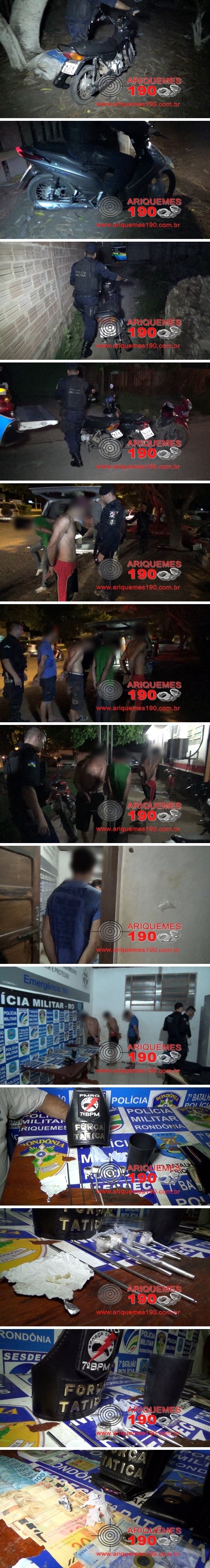Por volta das 17 horas desta sexta-feira (03/06), uma guarnição da Força Tática do 7º Batalhão da Polícia Militar realizava patrulhamento pela 12ª Rua do Setor 06 em Ariquemes, quando em dado momentos os Policiais receberam a informação que uma mulher aparentando pressa e nervosismo ao adentrar em uma residência trazendo consigo na garupa de uma bicicleta uma centrifuga de tampa roxa. De imediato, os Policiais adentraram o terreno percorrendo cerca de trinta metros, vindo a localizar algumas pessoas e a referida mulher. Um dos rapazes veio de encontro com os Policiais bastante alterado e xingando, este tentou agredir os PMS, sendo necessário o uso de imobilização e algemas para conter o mesmo. Enquanto a guarnição imobilizava o agente, os outros indivíduos correram para o interior da residência se desfazendo de pequenos objetos possivelmente invólucros de entorpecentes. Após o agente ser imobilizado, os Policiais foram em direção aos demais suspeitos, estes que não resistiram e saíram da residência. Com a situação controlada, a guarnição da Força Tática pediu apoio da Patrulha Alfa e Delta que compareceram ao local e auxiliaram nas buscas no interior da residência. No interior da casa foi localizada a centrifuga que fora vista por populares, posteriormente os Policiais localizaram quatro invólucros espalhados pela cozinha. Os Militares realizaram uma verificação em meio à mata que cerca a casa e localizou uma motoneta da marca Honda modelo Pop de cor roxa com placa NDA 5205 a qual possui restrição de furto conforme o BOP de n° 1673/2016 registrado na 3ª DPC. Outra motoneta da marca Honda modelo Biz de cor preta foi localizada, sendo que um dos suspeitos afirmou que a mesma era de sua propriedade e apresentou o CRLV do veículo a qual estava em nome de terceiros. Diante dos fatos, foi dado voz de prisão aos envolvidos e em seguida todos foram apresentados na 1ª Delegacia Geral de Polícia Civil de Ariquemes onde foi registrado o Boletim de Ocorrência Policial (BOP) sob o n° 5313/2016 para as providências cabíveis.
