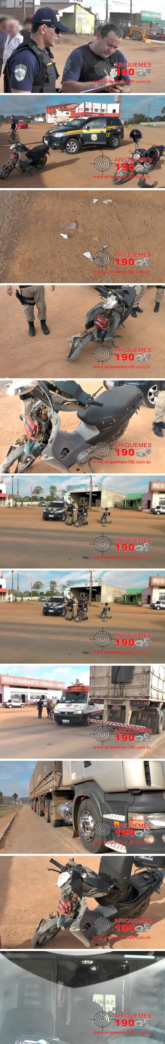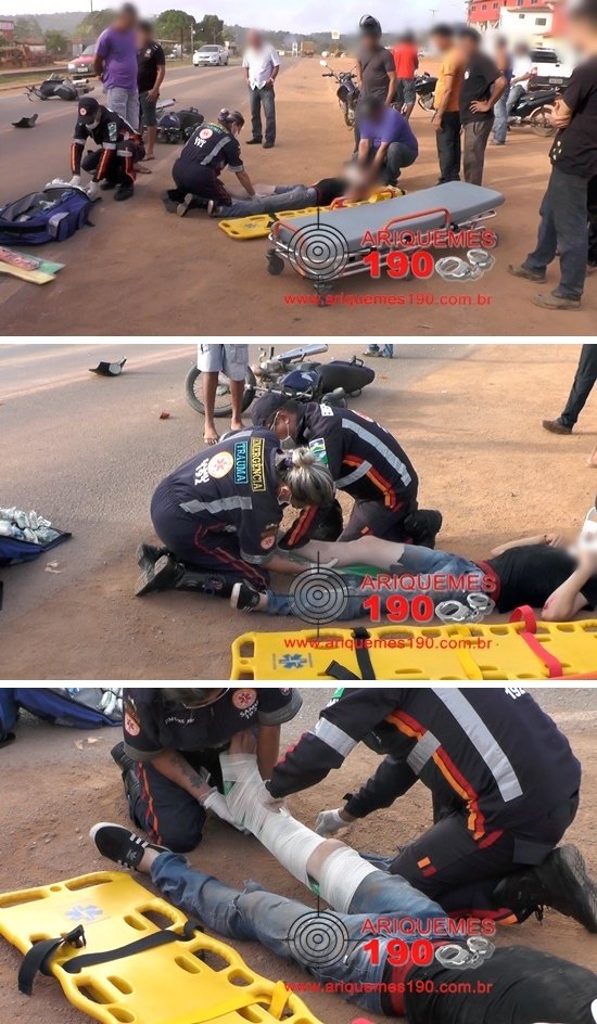 Por volta das 07 horas da manhã desta quarta-feira (08/06), as equipes do Serviço de Atendimento Móvel de Urgência (SAMU) e da Polícia Rodoviária Federal (PRF) foram acionadas a comparecer na BR-364, pois segundo informações havia ocorrido um acidente de trânsito. De imediato os socorristas se deslocaram até o local onde se depararam com duas vítimas, sendo que uma estava deitada e a outra sentada ao solo. Imediatamente os socorristas iniciaram os primeiros socorros à vítima mais ferida, utilizando o colar cervical e imobilizando a mesma. Em seguida o jovem foi encaminhado para a Unidade do SAMU juntamente com o outro motociclista, este recebeu o atendimento pré-hospitalar (APH) dentro da unidade do SAMU. O acidente envolveu uma motoneta da marca Honda modelo Biz de cor verde e uma motocicleta Honda modelo Fan 125 de cor azul. Segundo informações levantadas no local, um dos condutores transitava sentido Jaru, momento em que acabou colindo frontalmente com o outro veículo a qual iria adentrar um dos setores das proximidades. Após os primeiros socorros prestados às vítimas no local, ambas foram encaminhadas para o Pronto Socorro do Hospital Regional de Ariquemes. Uma das vítimas apresentava escoriações pelo corpo e uma suspeita de fratura na perna direita, a outra se queixava de muita dor na perna.