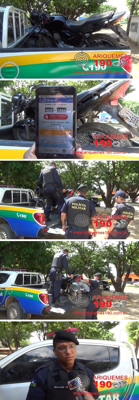 Por volta das 10 horas desta sexta-feira (10/06), os Policiais Militares: Laís e Silva Alves, comandados pelo Cabo Jonisson localizaram uma motocicleta da marca Honda, modelo CG-125 Fan de cor preta, placa NDS-3664/Ariquemes, abandonada na Avenida Jorge Teixeira. O veículo possuía restrição de Furto que aconteceu no dia 10 de outubro de 2015, conforme ocorrência nº 2631/16, registrada na Delegacia de Patrimônio em Ariquemes. A ocorrência nº 5543/16, foi registrada na Delegacia Geral em Ariquemes, para posterior restituição do veículo ao verdadeiro proprietário.