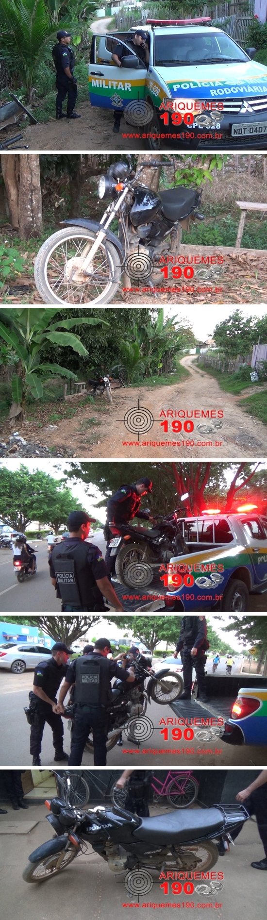 Por volta das 17h30min de segunda-feira (13/06), A Central de Operações do 7º BPM foi informada através de uma ligação anônima feita ao número de emergência 190, que na 5ª Rua do Setor Apoio Social havia uma motocicleta abandonada. De imediato os Policiais Militares: Amáro, Antônio Marcos e Emerson foram para o local indicado e encontraram abandonada em um local de pouco movimento uma motocicleta da marca Honda, modelo CG 125 de cor preta, placa NDG-2181/Alto Paraíso. Os Policiais realizaram consulta veicular e constataram que se trava de uma moto roubada no último dia 11 de junho de 2016 (sábado), conforme ocorrência nº 1769/16, registrada na Delegacia de Patrimônio em Ariquemes. O veículo foi conduzido para a Delegacia de Repressão aos Crimes Contra o Patrimônio, ondo foi registrada a ocorrência nº 1797/16, para que os procedimentos de praxe sejam adotados.