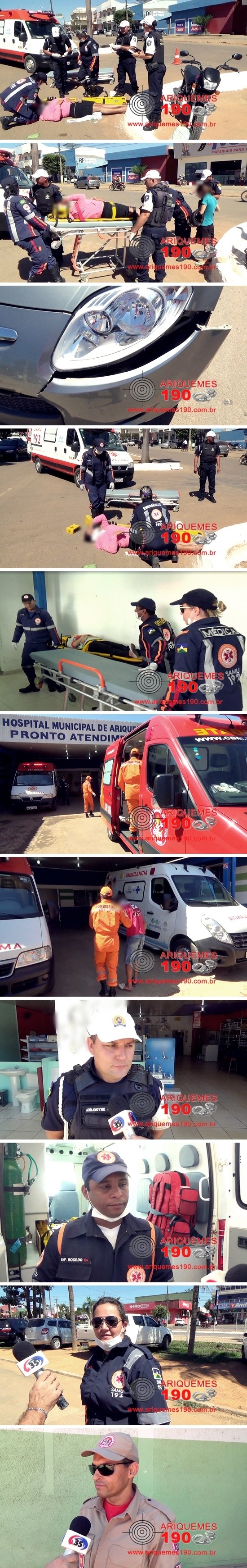 Por volta das 11h30min desta terça-feira (14/06), o Corpo de Bombeiros e as equipes do Serviço de Atendimento Móvel de Urgência (SAMU) foram acionados para atender duas ocorrências de acidente de trânsito, sendo uma na Avenida Tancredo Neves e outra na Avenida Guaporé do Setor 05. De imediato o Samu se deslocou até o acidente na Av. Tancredo Neves, onde se deparou com uma vítima ao solo. Imediatamente os socorristas prestaram o atendimento pré-hospitalar (APH) à vítima, utilizando o colar cervical e imobilizando a mesma. Após o procedimento de primeiros socorros a mulher foi levada até o Pronto Socorro do Hospital Regional de Ariquemes para receber atendimento médico especializado. Segundo informações levantadas no local, a condutora do carro da marca Fiat modelo Palio de cor grafite estava transitando pela Avenida Tancredo Neves, momento em que ao realizar o retorno acabou chocando-se com uma motoneta Pop. No mesmo momento em que o Samu atendia a esta ocorrência, os Bombeiros e outra equipe do Samu estavam prestando os primeiros socorros a duas vítimas de acidente na Avenida Guaporé. Após os primeiros socorros prestados às vítimas, as mesmas foram encaminhadas para o Hospital Regional de Ariquemes. Segundo informações levantadas no local, um dos condutores estava transitando pela Avenida Guaporé sentido Av. Tancredo Neves, quando outro condutor ligou a seta no instante em que iria adentrar a Rua Goiás, momento em que houve a colisão de ambos os veículos. Em entrevista concedida ao Canal 35 e Site Ariquemes o Enfermeiro Rogildo relatou que a mulher envolvida no acidente da Avenida Guaporé estava instável, orientada, consciente e aparentemente a mesma não sofreu nada de grave. Segundo o Sargento André do Corpo de Bombeiros, este relatou que o rapaz apresentava escoriação no pé. Segundo a Técnica de Enfermagem, esta relatou que a vítima do acidente da Av. Tancredo Neves apresentava escoriações leves e um pequeno corte no pé direito.