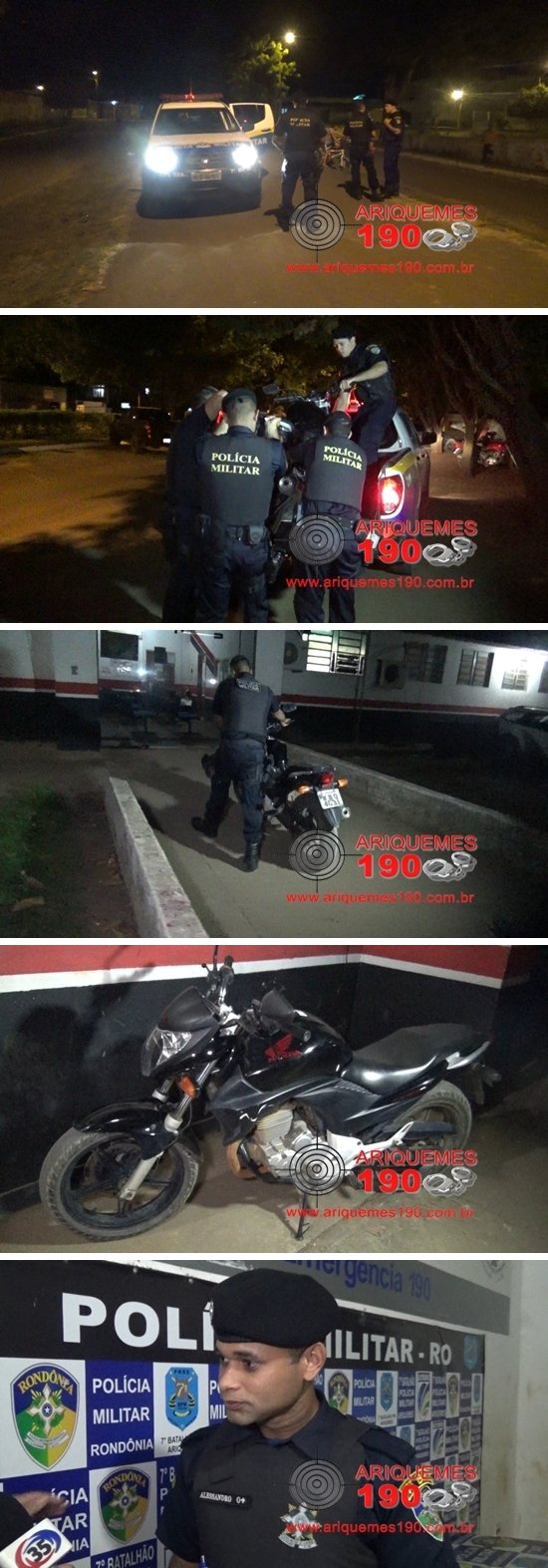 Por volta das 19h00min desta quarta-feira (15/06), uma guarnição da Polícia Militar foi acionada a comparecer na Praça do Setor 09 de baixo em Ariquemes, pois segundo informações a vítima havia encontrado sua motocicleta da marca Honda modelo CB-300 de cor preta abandonada na praça. De imediato os Policiais se deslocaram até o local onde constataram a veracidade das informações se deparando com o veículo a qual havia sido roubado na manhã desta quarta-feira (15/06) conforme o Boletim de Ocorrência Policial (BOP) de n° 1813/2016 registrado na 3ª DPC. Diante dos fatos, a moto foi conduzida para a 1ª Delegacia Geral de Polícia Civil de Ariquemes onde foi registrado o Boletim de Ocorrência Policial (BOP) de n° 5701/2016 para as providências cabíveis.