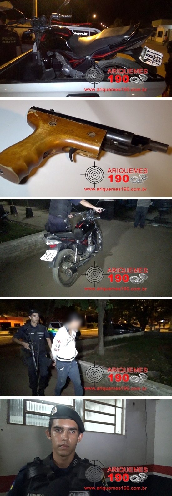 Por volta das 23h30min de sábado (18/06), os Policiais Militares: Tavares e J. Fernandes, comandados pelo Cabo Cartaxo, realizavam patrulhamento de rotina, quando foram acionados pela Central de Operações do 7º BPM a comparecerem na Rua Vimberê, no Setor 04, pois no local havia uma motocicleta roubada. A guarnição com apoio das Patrulhas Alpha e Delta foi para o endereço indicado e avistou um elemento desconhecido saindo da referida rua, conduzindo uma motocicleta da marca Honda, modelo CG 150 Fan de cor preta, placa NBT-7651/Ariquemes. As patrulhas fizeram acompanhamento, sendo que em dado momento avistaram o condutor jogando uma sacola plástica ao solo. O suspeito W.A.C. de 20 anos foi abordado e com ele nada de ilícito foi encontrado, mas a motocicleta era produto de roubo. Na sacola foi encontrada uma camiseta de cor preta, uma calça Jeans e um revólver de calibre 22 mm com cabo de madeira. Mediante os fatos o suspeito foi conduzido a Delegacia de Repressão aos Crimes Contra o Patrimônio, onde foi registrada a ocorrência nº 1846/16, para as providencias que o caso requer.