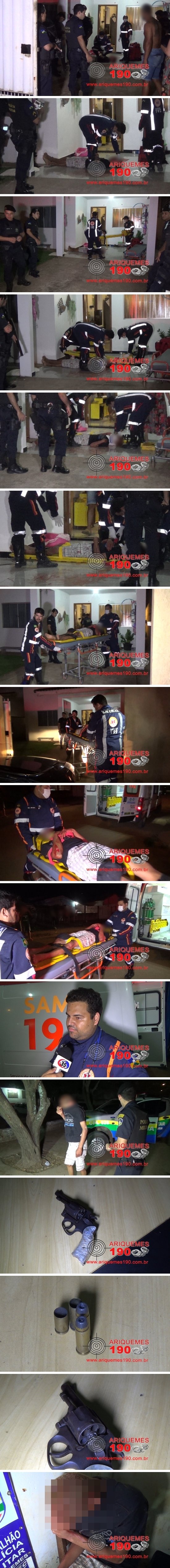 Por volta das 20h50min de segunda-feira (20/06), a o professor A.R.B. de 36 anos, estava em sua residência, localizada na Rua Gavião Real, no Jardim das Palmeiras, acompanhado de sua esposa S.K., de 29 anos e sua filha de 06 anos, quando dois elementos desconhecidos invadiram a casa perguntando se havia armas no local. O elemento F.B.A.C. que fez 18 anos nesta terça-feira (21/06), de posse de uma arma de fogo do tipo revólver, mandou a família deitar no chão, sendo que o professor permaneceu em pé, enquanto os marginais reviravam a residência em busca de objetos de valor, proferindo palavras de baixo calão e ameaças contra as vítimas. Em dado momento a vítima reagiu e entrou em luta corporal com o sujeito de segurava o revólver, sendo que o elemento efetuou dois disparos que não acertaram as vítimas. Os disparos alertaram os vizinhos que correram para ver o que estava acontecendo e acabaram ajudando a vítima a dominar e amarrar o marginal, até a chegada dos Policiais Militares: Orivaldo e Ronei, comandados pelo Cabo Rafael, que acionaram o Serviço de Atendimento Móvel de Urgência (SAMU) para conduzir o elemento ao Hospital Municipal, que sofreu algumas escoriações ao tentar fugir da residência. Ao ver que seu comparsa estava em apuros, o outro marginal se evadiu do local tomando rumo ignorado. O indivíduo saiu do hospital e foi conduzido a Delegacia de Repressão aos Crimes Contra o Patrimônio, onde foi registrada a ocorrência nº 1867/16, para que sejam adotadas as providências que o caso requer.
