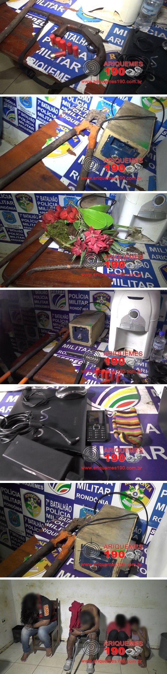 Por volta das 19 horas de terça-feira (21/06), uma equipe do Núcleo de Inteligência do 7º BPM (P-2), recebeu a informação que alguns elementos estariam de posse de vários objetos furtados dias atrás, conforme ocorrência nº 1831/16, registrada na Delegacia de Patrimônio e que eles estavam em um antigo hotel, localizado na Travessa Globo (Rebojo). Os Policiais localizaram os suspeitos e em seguida se deslocaram a residência do casal R.G.L. de 39 anos e V.S.S. de 25 anos, que forneceu dos nomes diferentes, situada em uma Alameda entre a 7ª e a 8ª Rua do Setor 02, onde foram localizados um Pé de Cabra e dois vasos com flores que são objetos de furto. Na residência do eletricista J.N. de 45 anos, situada na 8ª Rua do Setor 02, foi encontrado um bebedouro com galão de água, também furtado, uma escopeta de calibre 12 mm municiada e com outras cinco munições intactas, um alicate para cortar cadeados e correntes e um equipamento artesanal fabricado pelo suspeito para queimar Relógios de Energia Elétrica e para causar curto circuito em sistemas de segurança, alarmes e câmeras de segurança. Na residência da mulher J.S.S. de 27 anos, localizada no antigo Hotel Palmeira, no Rebojo, os Policiais encontraram um frigobar de cor branco, uma impressora e um notebook. A suspeita disse aos Policiais que tinha comprado os objetos pela quantia de R$ 700,00 em dinheiro de uma mulher, informando o nome dela e as características. Mediante os fatos todos foram conduzidos a Delegacia de Repressão aos Crimes Contra o Patrimônio, onde foi registrada a ocorrência nº 1876/16, para as devidas providências.