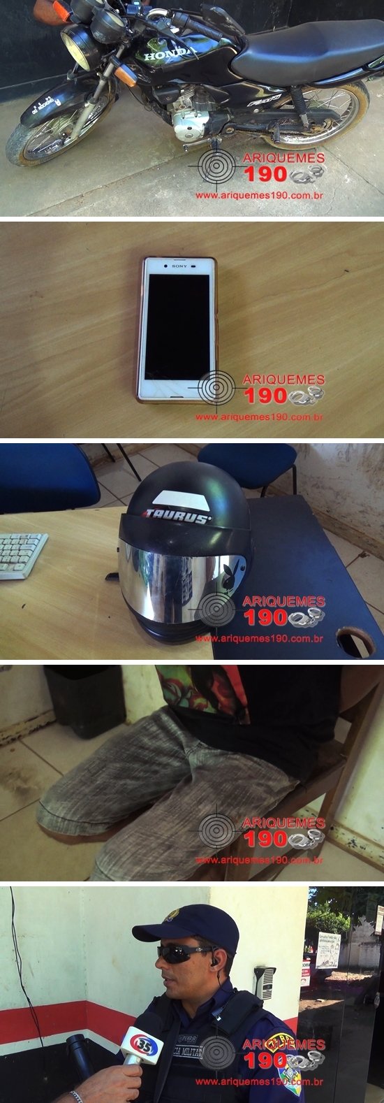 No inicio da tarde desta quinta-feira (23/06), a guarnição da Polícia Militar recebeu a informação que na Rua Fortaleza do Setor 03 em Ariquemes havia acabado de acontecer um roubo a pessoa. Já no local os Militares foram informados pela vítima que a mesma estava transitando pela Rua Fortaleza, momento em que foi surpreendida por um indivíduo a qual estava em uma motocicleta da marca Honda modelo Titan de cor preta, este fez menção de estar armado e subtraiu da vítima um aparelho celular da marca Sony de cor branca. Após o ato, o infrator se evadiu do local tomando rumo ignorado. Momentos depois após o roubo, os Policiais localizaram um rapaz com as mesmas características do agente, porém logo que o indivíduo avistou a guarnição empreendeu fuga. Os Militares conseguiram deter o menor após o mesmo adentrar em um estabelecimento comercial na Avenida Machadinho. Os Policiais ao realizarem revista pessoal localizaram no bolso de sua bermuda um aparelho celular da marca Sony, ao ser questionado, o mesmo confessou a pratica do ato infracional. Diante dos fatos, o adolescente foi conduzido e apresentado na Delegacia Especializada no Atendimento a Mulher onde foi registrado o Boletim de Ocorrência Policial (BOP) de n° 1022/2016 para as providências cabíveis. O Canal 35 e Site Ariquemes 190 foi informado que o menor apreendido completou 17 anos nesta quinta-feira (23/06).