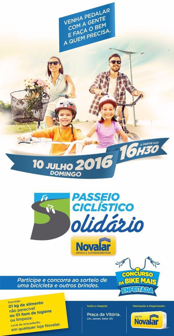 A Novalar está convidando toda a população de Ariquemes para participar do Passeio Ciclístico Solidário. O passeio será realizado no domingo dia 10 de julho a partir das 16h30min na Praça da Vitória localizada na Av. Jamari. Para participar é fácil, vá até a Novalar e se inscreva. A inscrição será apenas 1 KG de alimento não perecível ou um item de higiene ou limpeza. Para quem estiver participando na hora concorrerá a um brinde surpresa. Haverá o concurso da bicicleta mais enfeitada, participe e tenha a chance de ganhar um prêmio. Convide sua família e amigos para participar deste grande evento! As doações serão entregues para os lares carentes. E se você não quer pedalar, mas quer participar do evento não se preocupe, é só fazer sua inscrição, contribuir e também concorrer a prêmios. Está esperando o que? Venha participar do Passeio Ciclístico Solidário da Novalar.