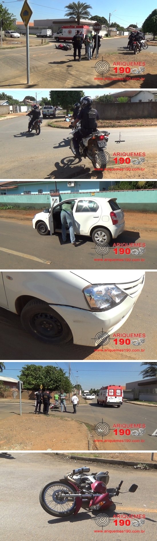 Por volta das 10 horas da manhã desta quarta-feira (06/07), a equipe do Serviço de Atendimento Móvel de Urgência (SAMU) foi acionada a comparecer na Avenida Quatro Cachoeiras com a Alameda Curitiba do Setor 03 em Ariquemes, pois segundo informações havia acontecido um acidente de trânsito. De imediato os socorristas se deslocaram até ao local onde se depararam com a vítima sentada em uma cadeira na calçada. No mesmo instante, o Samu prestou os primeiros socorros ao motociclista, utilizando o colar cervical e o imobilizando. Segundo informações levantadas no local, o condutor da motocicleta da marca Honda modelo CG Titan 150 de cor vermelha estava transitando pela Alameda Curitiba, momento em que no cruzamento da Av. Quatro Cachoeiras com a Alameda Curitiba houve uma colisão com o carro da marca Toyota modelo Etios de cor branca. Após o atendimento pré-hospitalar, a vítima foi encaminhada para o Hospital Regional de Ariquemes para receber atendimento médico especializado.