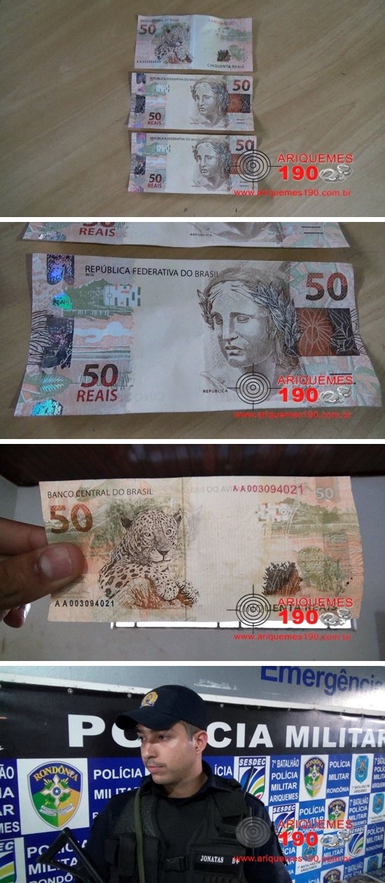 Por volta das 17h30min desta sexta-feira (08/07), a guarnição da Polícia Militar foi acionada a comparecer em um estabelecimento comercial localizado na Av. Capitão Silvio em Ariquemes, pois segundo informações um elemento havia usado notas falsas para pagar um produto. De imediato os Militares se deslocaram até ao local onde constataram a veracidade das informações ao entrarem em contato com a vítima. Segundo a proprietária do estabelecimento, esta relatou que um elemento alto, magro e moreno adentrou em seu comercio e pediu dois galões de óleo diesel. Em seguida o indivíduo efetuou o pagamento com três notas de 50 reais falsas, posteriormente se evadiu do local tomando rumo ignorado. Diante dos fatos, o material apreendido pela Polícia Militar foi apresentado na Delegacia de Polícia Civil onde foi registrado o Boletim de Ocorrência Policial (BOP) para as devidas providências.