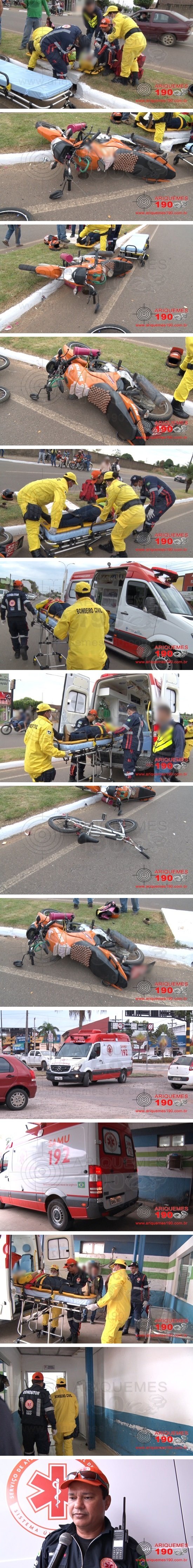 Por volta das 18h50min deste sábado (09/07), a equipe do Serviço de Atendimento Móvel de Urgência (SAMU) foi acionada a comparecer na Avenida Rio Branco do Bairro Jardim Jorge Teixeira em Ariquemes, pois segundo informações havia ocorrido um acidente de trânsito. De imediato os socorristas se deslocaram até ao local onde constataram a veracidade das informações ao se deparar com um rapaz ao solo. No mesmo instante, o SAMU prestou os primeiros socorros ao motociclista e após verificar a perna do rapaz constataram que a mesma havia sido fraturada em vários lugares. Outra equipe do SAMU foi acionada para comparecer ao local e prestar apoio aos outros socorristas. Segundo o Boletim de Ocorrência de Acidente de Trânsito (BOAT) de n° 279/2016, este narra que o condutor da motocicleta da marca Honda modelo Bros 150 de cor preta transitava pela Avenida Rio Branco sentido Setor Jardim das Palmeiras, quando em dado momento colidiu com um veículo da marca Fiat modelo Strada de cor branca que se encontrava estacionado. Após o atendimento pré-hospitalar (APH), a vítima foi encaminhada para o Hospital Regional de Ariquemes para receber atendimento médico especializado. Em entrevista concedida ao Canal 35 e Site Ariquemes 190 a Técnica de Enfermagem relatou que a vítima sofreu em seu membro inferior direito duas fraturas exposta na região da tíbia, sendo uma inferior e outra posterior. O motociclista também sofreu uma fratura no fêmur. Devido ao seu estado de saúde o mesmo possivelmente iria ser encaminhado para o Hospital João Paulo II de Porto Velho.