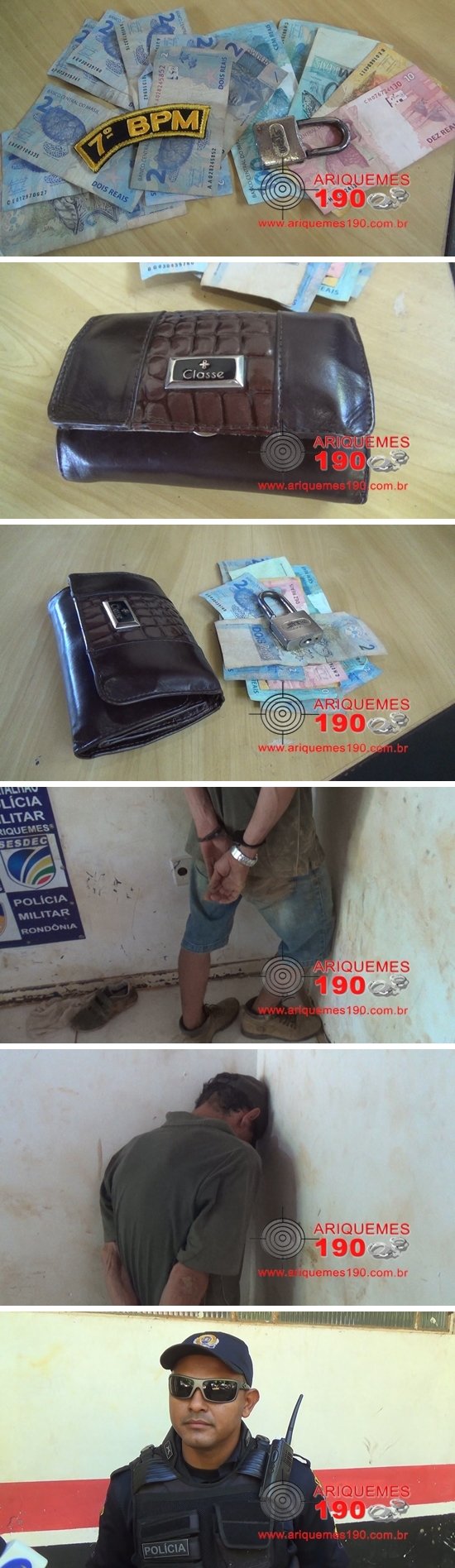 Por volta das 15h30min desta segunda-feira (11/07), a guarnição da Polícia Militar composta pelos PMS: Cabo da Silva, Soldado Grinevald e Soldado Madeira, estava em patrulhamento pela Avenida JK, quando uma mulher os parou relatando que havia sido vítima de furto e que populares estavam segurando o elemento. Segundo a mulher, esta relatou que estacionou seu veículo na residência que é de sua propriedade localizada na Alameda Bem-Te-Vi com a Travessa Codorna do Setor 02 e que alguns usuários de entorpecentes tomaram conta da residência. Após a vítima descer da motoneta se deparou com um usuário dentro da sua residência e logo o expulsou da mesma. Em seguida, a mulher percebeu que o elemento havia arrombado o baú do seu veículo e estava pegando sua carteira de cor marrom que possuía todos os seus documentos pessoais, cartões de banco e a quantia de R$ 350,00 reais em espécie. No mesmo instante a vítima pediu ajuda para populares que seguraram o infrator. Após a coleta de dados, os Militares questionaram ao usuário se o mesmo havia cometido tal furto e o mesmo assumiu o crime e ainda relatou que teria jogado a carteira próxima à residência e tirado apenas o dinheiro. Em revista pessoal foi encontrado no bolso do indivíduo a quantia de R$ 350,00 reais pertencentes à vítima. Diante dos fatos, o elemento, a vítima e a carteira foram encaminhados e apresentados na 3ª Delegacia de Polícia Civil de Ariquemes especializada na Repressão aos Crimes Contra o Patrimônio onde foi registrado o Boletim de Ocorrência Policial (BOP) de n° 2030/2016 para as providências cabíveis.