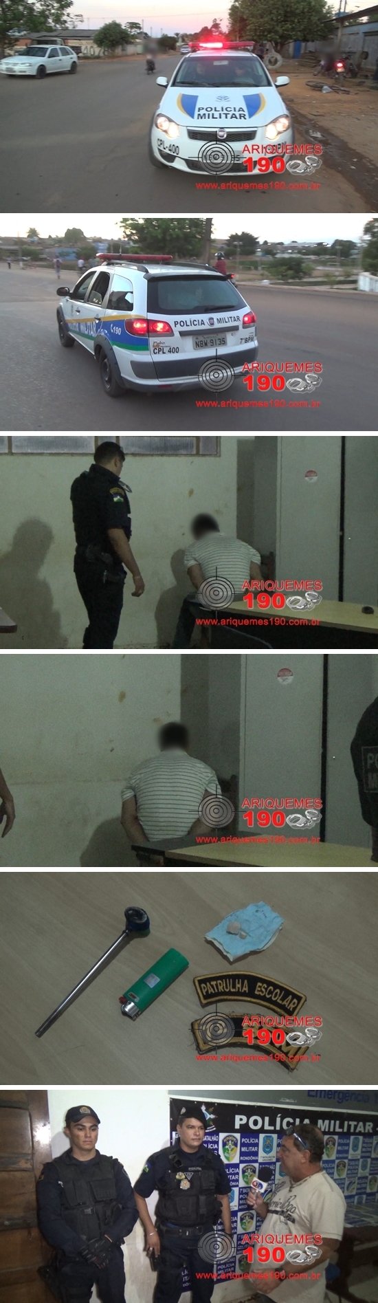 Por volta das 18 horas desta segunda-feira (11/07), a guarnição da Polícia Militar da Patrulha Escolar estava em patrulhamento pela Praça do Setor 09, momento em que próximo de uma escola se deparou com um elemento em atitude suspeita. No mesmo instante os Policiais deram voz de parada ao mesmo e em revista pessoal foi localizado em suas vestes duas porções de substância ilícita. Segundo o indivíduo, as porções seriam de crack. Diante dos fatos, o homem foi conduzido e apresentado na 1ª Delegacia Geral de Polícia Civil de Ariquemes onde foi registrado o Boletim de Ocorrência Policial (BOP) de n° 6665/2016 para as devidas providências.