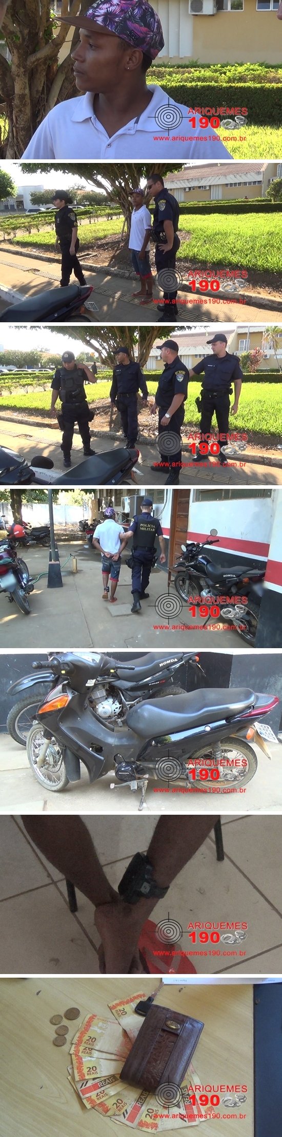 Por volta das 08h30min desta terça-feira (12/07), o cidadão J.N.R. de 33 anos, descia a Avenida Tancredo Neves, no centro da cidade, quando avistou um elemento estacionando a motoneta da marca Honda, modelo Biz 100 de cor preta, placa OHM-0698/Ariquemes, em frente ao Fórum, sendo que a referida Biz havia sido roubada de sua sobrinha na última quarta-feira (06/07), no Parque das Gemas, conforme a ocorrência nº 1993/16, registrada na Delegacia de Patrimônio. O condutor da Biz Vitor Afonso Lopes, de 19 anos, foi ao Fórum pedir Redução de Pena e foi com uma motoneta roubada, trajando bermuda e Tornozeleira Eletrônica. Quando os Policiais Militares: Soares, Tanaka e Cerqueira chegaram em frente ao Fórum, o suspeito vinha saindo e ao perceber a movimentação jogou a chave da Biz na grama do canteiro e continuou caminhando como se nada estivesse acontecendo. Com o sujeito a guarnição encontrou a quantia de R$ 240,00 em dinheiro, um par de brincos dourados e um cartão de memória da marca Smart. O suspeito disse aos Policiais que pegou a motoneta emprestada de um elemento branco e magro de estatura mediana, que reside no Setor 09 de baixo, sem saber que o veículo era roubado. Durante a detenção, foi constatado que o elemento seria o autor de vários roubos, dentre eles um crime onde a vítima foi alvejada com um tiro. Os Policiais mantiveram contato telefônico com as vítimas de um Latrocínio, conforme ocorrência nº 6554/16, sendo que estas repassaram as mesmas características do indivíduo preso, sendo que motoneta foi à mesma usada no crime. A guarnição fez uma averiguação na residência do elemento, situada na 9ª Rua do Setor 09, mas nada de ilícito foi localizado. Mediante os fatos o sujeito foi apresentado a autoridade plantonista na Delegacia Geral, onde foi registrada a ocorrência nº 6678/16, para as providencias cabíveis.