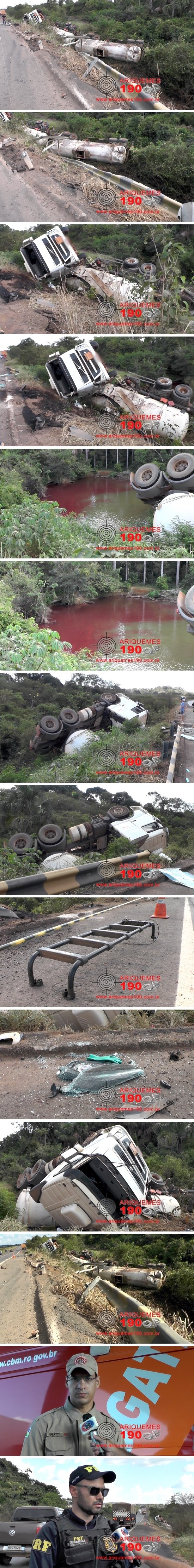 Por volta das 14h30min desta quarta-feira (13/07), uma carreta bitrem tanque com placas de Presidente Médici, que fazia o itinerário Porto Velho – Vilhena acabou saindo da pista e capotando ao lado da BR-364, na altura do Km-543, a cerca de cinco quilômetros do trevo de acesso a cidade de Rio Crespo e a aproximadamente 28 quilômetros de Ariquemes. Quando a Unidade de Resgate do Corpo de Bombeiros chegou ao local do acidente para prestar auxílio ao condutor, uma médica que estava próxima e viu o acidente, de imediato prestou socorro ao motorista, diagnosticando aos Bombeiros Traumatismo Craniano. A vítima estava com surtos de esquecimento, ele não lembrava se saiu sozinho da carreta ou se alguém o ajudou a sair, também não lembrava como foi parar fora da pista de rolamento. O motorista disse que reside em Vilhena e que tinha viajado a Porto Velho onde deixou uma carga de soja, mas devido ao Estado de Choque, é bem provável que a carga tenha sido combustível, sendo que retornava a Vilhena vazio. A carreta antes de capotar destruiu o guard rail metálico, algumas árvores de pequeno porte e todo matagal no acostamento da BR por aproximadamente mil metros, até parar a beira do Rio Santo Amáro, onde vários litros de óleo diesel, aparentemente do tanque da carreta escorreram para dentro do córrego, que deságua no Rio Jamari. Uma equipe da Polícia Rodoviária Federal foi para local coordenar o trânsito, já que a movimentação de veículos, principalmente de caminhões é muito grande. A Polícia Técnico-Científica (Politec) foi acionada assim como uma equipe do Instituto Brasileiro do Meio Ambiente e dos Recursos Naturais Renováveis (IBAMA), pois existe o risco de um acidente ecológico na região.