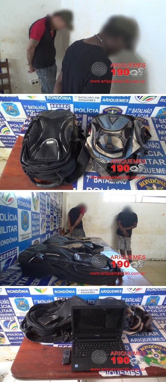 Por volta das 07h30min deste sábado (16/07), a guarnição da Polícia Militar foi acionada a comparecer em um estabelecimento comercial localizado na Travessa São Luis do Setor 03 em Ariquemes, onde segundo informações havia acontecido um furto. De imediato os Policiais se deslocaram até ao local onde foram informados pela vítima que durante a madrugada elementos adentraram seu estabelecimento comercial e furtaram a quantia de R$ 600,00 em dinheiro, um notebook, um celular e outros objetos. Diante dos acontecimentos, os Militares realizaram as buscas pelas proximidades, momento em que receberam a informação que na rodoviária havia dois elementos que estariam vendendo um celular e um notebook por um pequeno preço. Na posse destas informações, os Militares se deslocaram até ao local onde constataram a veracidade das informações se deparando com os indivíduos. Após verificar sobre a procedência dos objetos, os PMS confirmaram que o notebook e o celular eram da vítima. Diante dos fatos, os suspeitos foram conduzidos para a Delegacia de Polícia Civil de Ariquemes onde foi registrado o Boletim de Ocorrência Policial (BOP) para as providências cabíveis.