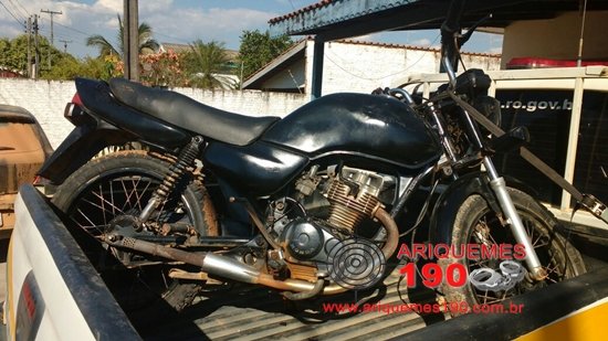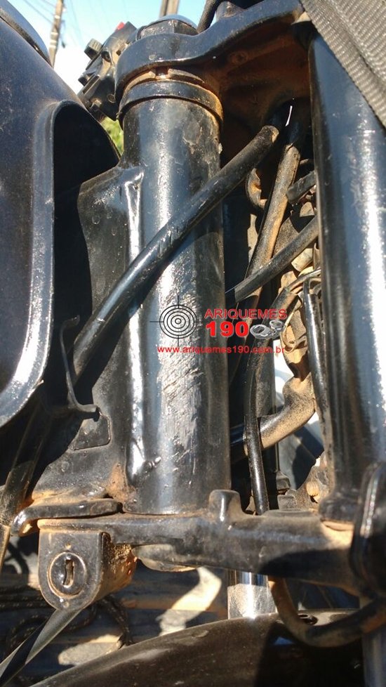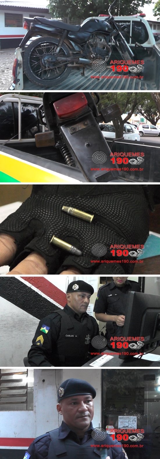 Por volta das 15 horas desta segunda-feira (25/07), os Policiais: Sargento Carlos, Soldado Laís e Soldado Silva Alves estavam em patrulhamento de rotina pelo Bairro Novo Horizonte, momento em que avistaram três pessoas em atitude suspeita. Em revista pessoal foi encontrado com o adolescente duas munições de calibre 22. Com a mulher não foi localizado nada de ilícito. Já com o jovem de 20 anos, este estava com uma motocicleta sem placa a qual estava estacionada na área de sua residência, próximo do local da abordagem. O veículo estava com o número de identificação do chassi raspado. Os Militares conseguiram identificar apenas a numeração do motor e constataram após a pesquisa que a moto era uma motocicleta da marca Honda modelo CG Titan de cor azul. O rapaz relatou que havia comprado o veículo pelo valor de 800 reais e que não possuía nenhum documento da moto, porém o antigo proprietário garantiu que tinha o recibo da moto e ainda um pedaço da placa. O infrator ainda comentou que havia mudado a cor da moto para preta. Diante dos fatos, os envolvidos e objetos apreendidos foram conduzidos para a 1ª Delegacia de Polícia Civil de Ariquemes onde foi registrado o Boletim de Ocorrência Policial (BOP) de n° 7197/2016 para as providências cabíveis.
