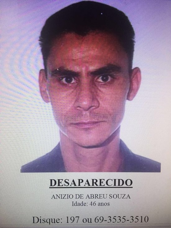 Anízio de Abreu Souza está desaparecido desde o dia 18/06/2016 (sábado) em Monte Negro - RO, no dia da cavalgada, o mesmo é padeiro e trabalhava em uma padaria na cidade, porém encontra-se desaparecido. Qualquer informação que leve ao paradeiro do mesmo, favor ligar para o numero 197 disque denuncia da Policial Civil ou (69) 3535-3510.