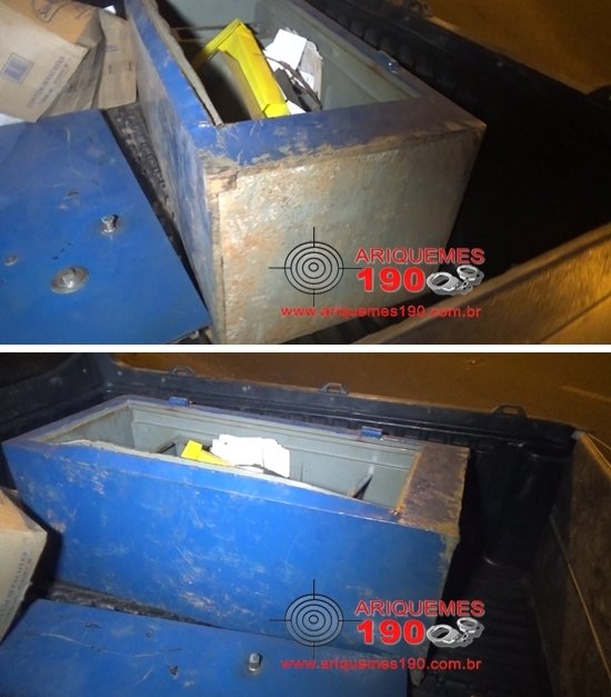 Por volta das 16 horas de sábado (30/07), os Policiais Militares: Thiago Oliveira, Racanelli e Henrique, foram acionados a comparecer no desvio que liga as cidades de Ariquemes a Rio Crespo, localizado na RO-257, pois no local havia um cofre estourado e abandonado no mato. Os Policiais constataram que se tratava de um cofre furtado na madrugada do mesmo dia em uma loja de acessórios automotivos, situada na Avenida Massangana, no Setor Apoio Rodoviário, conforme ocorrência nº 243/16, contendo em seu interior Carteiras de Trabalho dos funcionários, Currículos, documentos da empresa, Promissórias e quatro folhas de cheque que estavam na beira da estrada. A vítima foi avisada e se prontificou em ir buscar o referido cofre no local, sendo que em seguida registrou a ocorrência nº 2121/16, na Delegacia Geral, para as providências cabíveis. O furto do cofre aconteceu na madrugada de sexta para sábado, sendo que o Gerente S.M.S. de 35 anos chegou para abrir a loja e percebeu que marginais haviam feito um buraco na parede e levado o cofre contendo documentos e a quantia de R$ 500,00 em dinheiro.