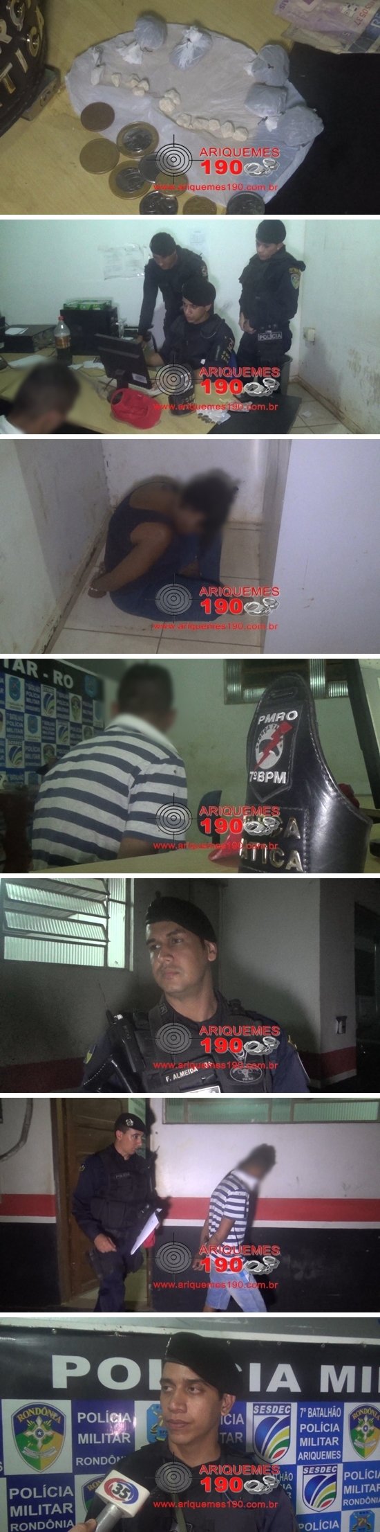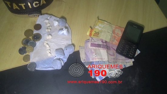 Por volta das 21h20min desta segunda-feira (01/08), a guarnição da Força Tática do 7º Batalhão da Polícia Militar estava em patrulhamento pela 1ª Rua do Setor 02 em Ariquemes, momento em que observaram um casal conversando, sendo que estes ao perceberem a presença dos Policiais se separaram inesperadamente tomando sentidos opostos. De imediato os Militares realizaram o cerco policial onde presenciaram o momento em que o jovem arremessou algum objeto pequeno no meio do matagal. Em revista pessoal foi encontrado nas roupas intimas do rapaz cinco porções de uma erva que aparentava ser maconha, sendo que em um dos bolsos foi localizado a quantia de R$ 41,60. Com a mulher foi encontrado em suas roupas intimas onze pedras que possivelmente seria crack e uma porção de pó branco que provavelmente seria cocaína. Segundo a jovem, ela seria amasia do rapaz e que a substância que havia sido encontrada em posse da mesma era de propriedade do jovem. A Força Tática realizou buscas para localizar o objeto que o indivíduo havia se desfeito, porém não obteve êxito. Diante dos fatos, o casal recebeu voz de prisão, sendo lidos e respeitados seus direitos constitucionais e em seguida foram conduzidos para a 1ª Delegacia Geral de Polícia Civil de Ariquemes onde foi registrado o Boletim de Ocorrência Policial (BOP) de nº 7510/2016 para as providências que o caso requer.