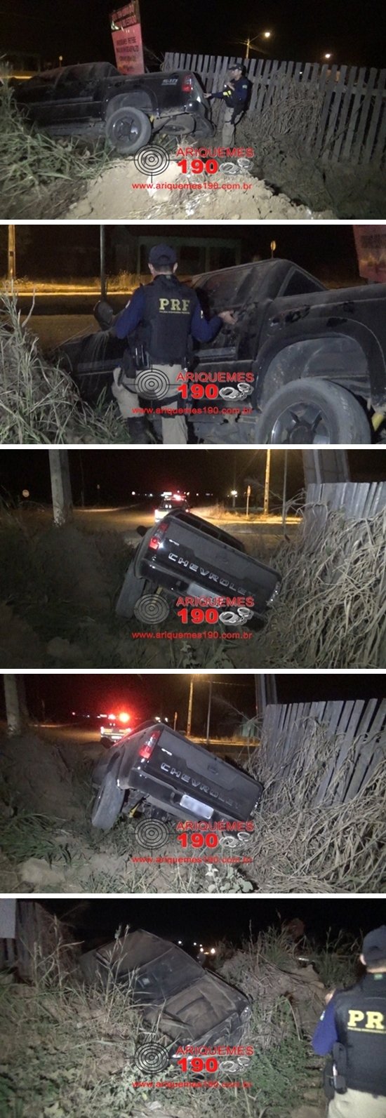 Por volta das 23h30min desta quinta-feira (04/08), a Polícia Rodoviária Federal (PRF) foi acionada a comparecer na Avenida Hugo Frey com a BR-364 em Ariquemes, onde segundo informações havia acontecido um acidente de trânsito. De imediato os Policiais se deslocaram até ao local onde se depararam com uma caminhonete da marca Chevrolet, modelo S10 de cor preta caída em um bueiro. Segundo o condutor, este estava transitando pela rodovia, momento em que um carro entrou em sua frente fazendo com que o mesmo perdesse o controle da direção do veículo vindo em seguida cair no barranco. O acidente não deixou nenhum ferido, apenas danos materiais no veículo.