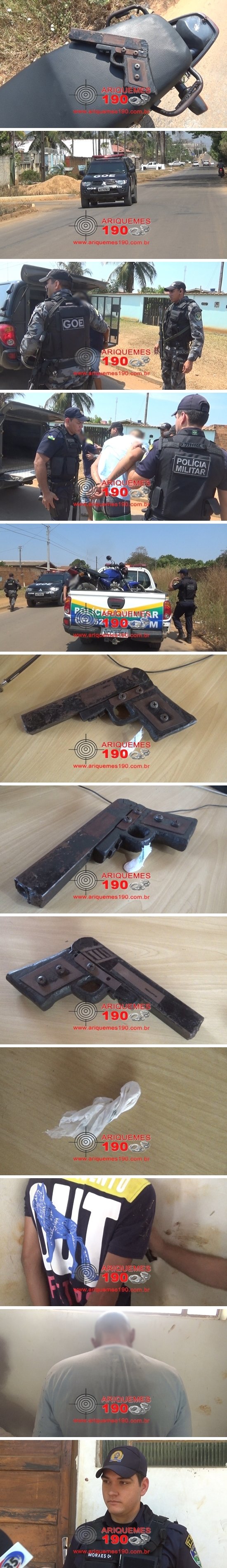 Por volta das 13h00min desta quarta-feira (10/08), a guarnição da Patrulha Charlie estava em patrulhamento pela Avenida Canaã, momento em que se deparou com dois indivíduos em uma motocicleta de cor azul em atitude suspeita, sendo que ao avistarem a guarnição aumentaram um pouco a velocidade. Os Policiais perceberam que na cintura do rapaz que estava na garupa havia um volume em sua cintura, levantando a suspeita que o mesmo poderia estar portando uma arma de fogo. Diante da situação, os Militares decidiram fazer acompanhamento, sendo que conseguiram abordar os infratores na Avenida Perimetral Leste do Bairro Parque das Gemas. Em revista pessoal os PMS localizaram em posse do Menor de idade um simulacro de cor preta e com o Maior uma porção de entorpecente que aparentava ser cocaína. Uma guarnição do Grupo de Operações Especiais (GOE) foi acionada a comparecer ao local onde prestaram apoio aos demais Policiais. Diante dos fatos, a dupla, a droga e a arma de brinquedo foram apresentadas na 1ª Delegacia Geral de Polícia Civil de Ariquemes onde foi registrado o Boletim de Ocorrência Policial (BOP) de n° 7875/2016, para as devidas providências. O Conselho Tutelar foi acionado a comparecer na Delegacia de Polícia Civil para acompanhar o registro do BOP.