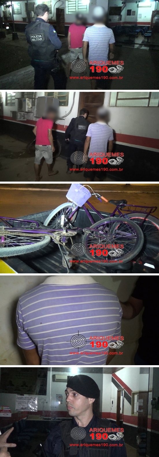 Por volta das 22h00min desta quarta-feira (10/08), os Policiais Militares: Soldado Bruno, Soldado Diego e Soldado Henrique foram acionados a comparecer em uma residência localizada na 6ª Rua do Setor 04 em Ariquemes para atender uma ocorrência de roubo. Já no local, os Militares foram informados pelas vítimas que ambas estavam em frente à residência, quando em dado momento dois indivíduos de bicicleta, sendo um de camiseta de cor vermelha e pele morena e outro de camisa de cor clara aparentemente azul, as abordaram e anunciaram o assalto. Os elementos subtraíram das vítimas uma bolsa feminina de cor marrom e um relógio de cor dourada. Em seguida os infratores se evadiram do local tomando sentido Apoio Social. Após a coleta dos dados, os Policiais iniciaram diligências pela cidade no intuito de localizar os infratores. Em patrulhamento pela Avenida Perimetral Leste do Setor 09 de baixo os PMS vieram a localizar dois indivíduos com as mesmas características e estes ao avistarem a viatura se separaram, porém foram alcançados e abordados. Segundo o jovem de 22 anos, este relatou ser amigo do rapaz de 20 anos, porém o rapaz alegou não conhecer o outro indivíduo. Em ato continuo, os Policiais constataram que os indivíduos seriam os elementos que haviam cometido o roubo alguns minutos antes. Diante dos fatos, a dupla foi conduzida para a 3ª Delegacia de Polícia Civil de Ariquemes onde foi registrado o Boletim de Ocorrência Policial (BOP) de n° 2308/2016, para as devidas providências. Até o momento do registro do BOP os objetos roubados não haviam sido encontrados.