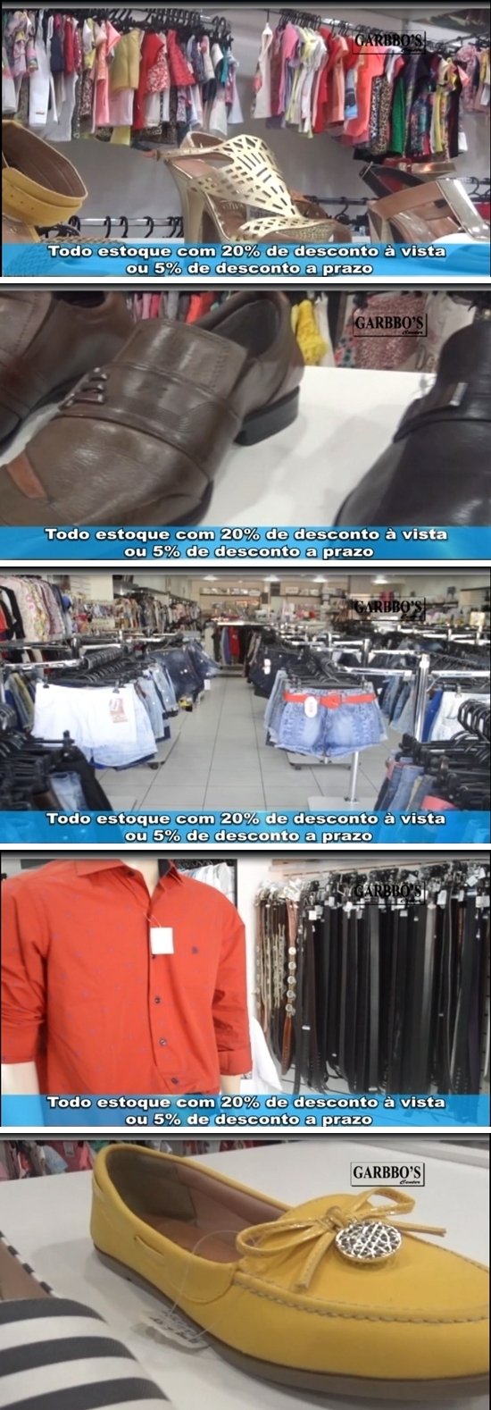 A Garbbo’s Center lançou uma incrível promoção! Todo o estoque da loja com 20% de desconto à vista ou 5% parcelado. Compre para toda a família e ganhe esse super desconto! Está esperando o que? Venha correndo aproveitar! Garbbos Center, vestindo você e toda a sua família. Na Rua Piquiá - Centro. Telefone: 3536-8807.