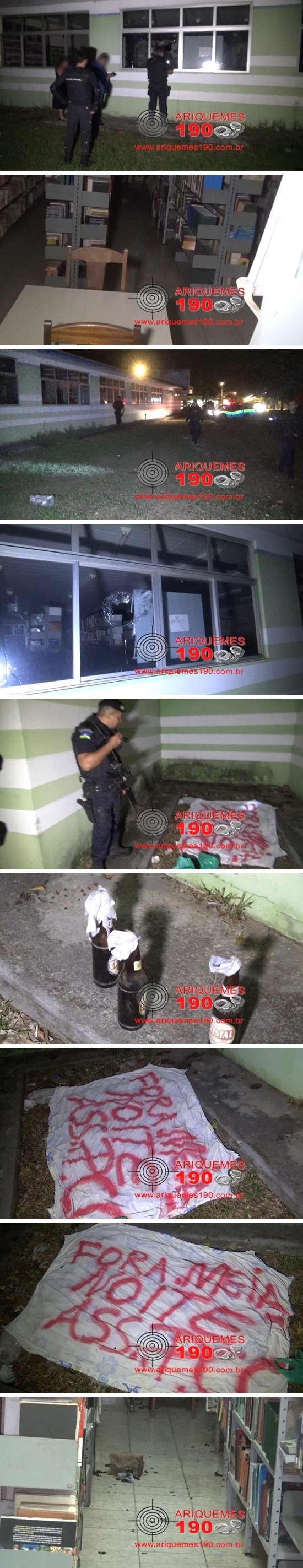 Por volta das 20h15min de sábado (20/08), elementos não identificados chegaram em frente a biblioteca municipal Pedro Tavares Batalha, localizada na Avenida Tancredo Neves, no Setor Institucional e arremessaram um Coquetel Molotov (garrafa contendo gasolina com um pano da boca) amarrada em uma pedra de concreto que estilhaçou as vidraças da instituição. Os Policiais Militares da Patrulha Alpha: Racanelli, Lucas e Anderson foram para o local. Foi constatado que o pano colocado na boca da garrafa era muito pequeno e o fogo não se propagou havendo pequenos danos ao patrimônio público. Nas imediações os PMs encontraram outros três Coquetéis Molotov que não foram usados e duas faixas com dizeres em apoio aos rebelados assinadas pelo Primeiro Comando da Capital (PCC). A guarnição realizou buscas pela região da biblioteca, mas não localizou nenhum suspeito. Mediante os fatos a ocorrência nº 2410/16, foi registrada na Delegacia de Repressão aos Crimes Contra o Patrimônio, que já investiga o caso.