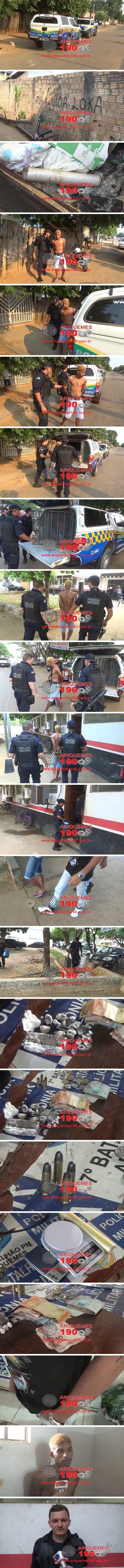 Por volta das 16 horas de quinta-feira (25/08), os Policiais Militares da Patrulha Delta: Ribeiro, Grinevald e Madeira realizavam ronda de rotina pelas imediações de um barraco onde a PM tem várias informações sobre o funcionamento de uma Boca de Fumo, localizada na Rua Albina Sordi, no Setor 11, sendo que um tal Neguinho Marcelo que possui Mandado de Prisão comercializava todos os tipos de substancias entorpecentes, inclusive trocando drogas por objetos roubados e furtados. Quando a guarnição em frente à residência avistou os irmãos W.B.S. de 20 anos e W.A.S. de 23 anos, sentados próximos do elemento Marcelo Douglas dos Santos, de 21 anos, vulgo Cabide, que estava em pé na porta do barraco. Ao perceber a presença da viatura, o indivíduo correu para dentro do barraco com a intensão de se esconder ou esconder algo ilícito que não gostaria que a Polícia encontrasse. Os PMs foram rápidos e adentraram o barraco a tempo de flagrar Neguinho Marcelo com uma bolsinha nas mãos, momento em que o elemento ao ver que seria abordado jogou a referida bolsinha longe e tentou se evadir correndo, mas foi alcançado e preso. No interior da bolsinha os Policiais localizaram 09 parangas e um tablete grande contendo algo semelhante à maconha, 04 parangas contendo pedras aparentando ser crack e duas parangas, sendo uma pequena e uma grande contendo algo que não foi devidamente identificado, mas aparenta ser crack e 04 munições de calibre 38 mm, duas balanças de precisão, papel para embalar drogas, além da quantia de R$ 264,45 em dinheiro, uma televisão da marca LG de 42 polegadas, duas centrífugas, uma caixa de som amplificada, uma botija de 5 kg e um relógio de pulso nas cores amarelo e preto, Neguinho Marcelo disse aos Policiais que possui Passagem pela Policia por Tráfico e que é foragido do Sistema Prisional. A guarnição localizou dois Mandados de Prisão por Homicídio em desfavor de Neguinho Marcelo, conforme os Processos nº 1224-22.2016.8.22.0002, expedido pela 1ª Vara Criminal de Ariquemes, por Homicídio Qualificado, que ainda não foi julgado e Processo nº 4387-44.2015.8.22.0002, expedido pela 2ª Vara Criminal de Ariquemes, por Crimes Contra a Vida, tendo por este crime a pena de 06 anos, 09 meses e 26 dias de reclusão para cumprir em regime fechado. Os irmãos disseram que estavam passando em frente ao barraco de Neguinho Marcelo que os chamou para fumarem um baseado. Mediante os fatos os três indivíduos e os objetos apreendidos foram apresentados à autoridade plantonista na Delegacia Geral, onde foi registrada a ocorrência nº 8500/16, para as devidas providências.