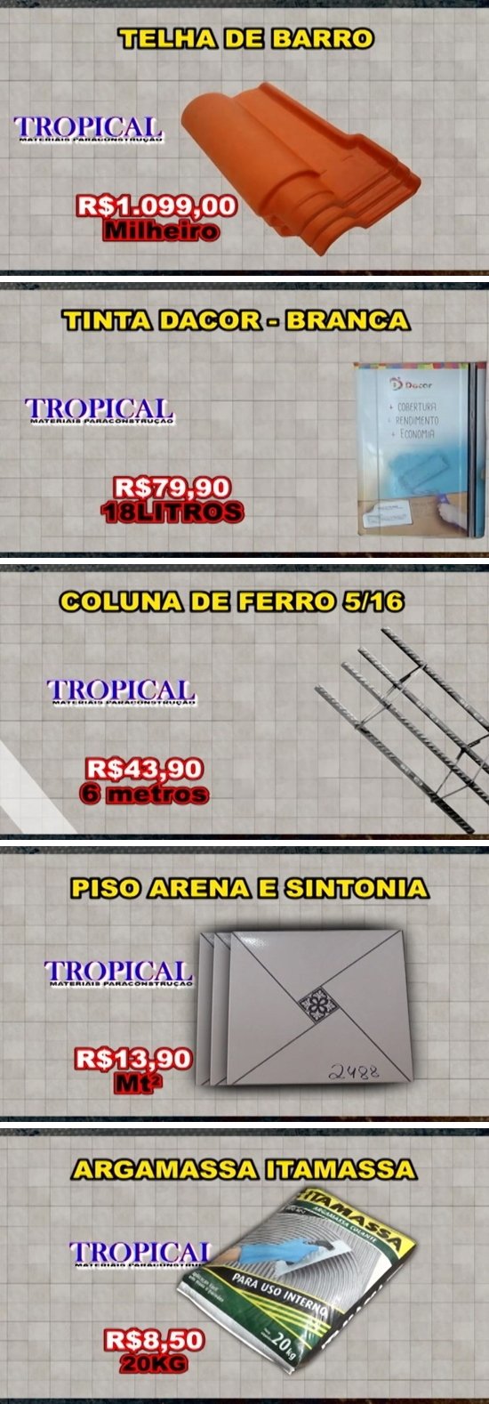 Para você que está construindo ou reformando o melhor lugar é na Tropical Materiais para Construção. Confira as promoções: