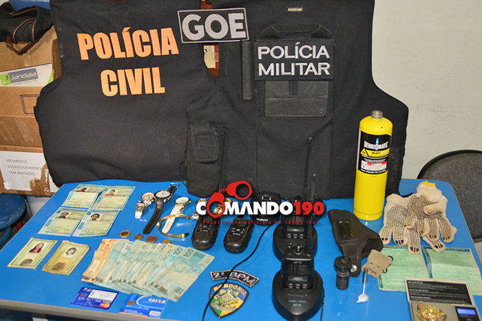 Em poder da quadrilha, os policiais encontraram uma banana de dinamite e um kit usado para explodir caixas eletrônicos, dois rádios comunicadores sintonizados na frequência da PM, joias, a quantia de R$ 5 mil reais, munição calibre 357, vários objetos roubados e duas CNH’s falsas. Também foram encontrados um saco contendo armadilhas que servem para furar pneus de carro.