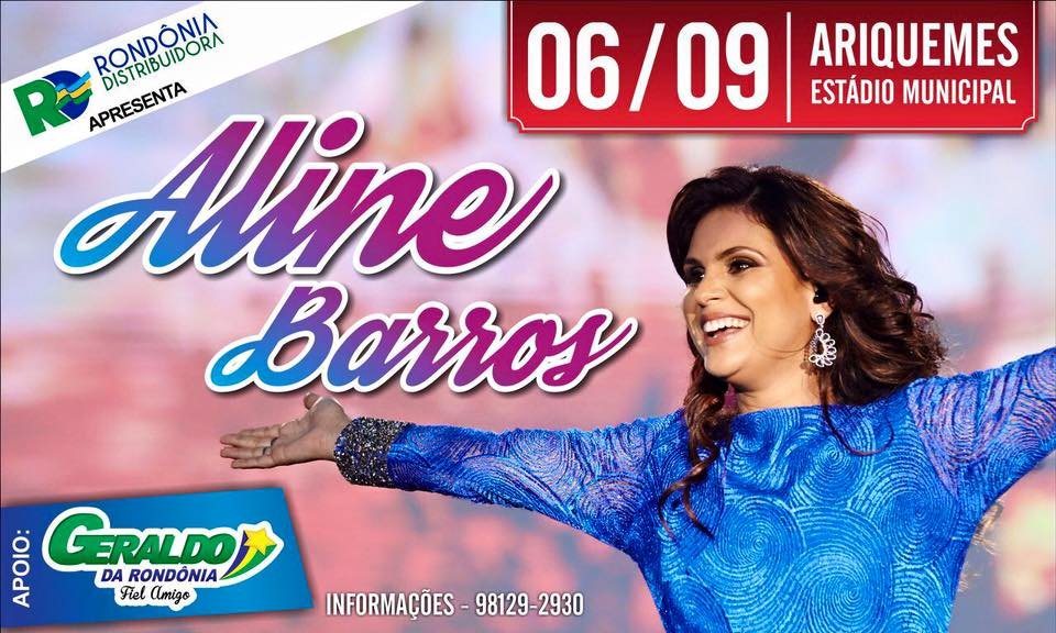 Ariquemes receberá a presença de uma das cantoras gospel mais conhecida do Brasil, Aline Barros. O Show terá iniciou às 19h30min do dia 06/09/2016 (terça-feira) no Estádio Municipal de Ariquemes. Os Pontos de Vendas para você adquirir os ingressos está sendo no Polo Wear (IG SHOPPING) e na Rondônia Distribuidora.