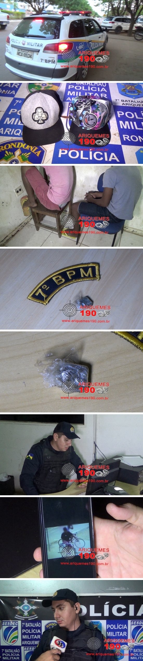 Por volta das 17h30min de terça-feira (06/09), os Policiais Militares da Patrulha Escolar de Motocicleta: Aguiar, Sala, Domingues e Contrin realizavam patrulhamento de rotina pelas ruas da cidade, quando avistaram na Rua Fernando Henrique Martins, no Setor 08, dois indivíduos em atitude suspeita. Os menores de 12 e 17 anos, foram abordados e com eles foi encontrada uma paranga contendo algo semelhante à maconha. Na Delegacia os Policiais perceberam que os menores usavam bonés parecidos com os bonés que dois sujeitos usavam quando roubaram uma distribuidora no Setor 06, conforme ocorrência nº 2505/16. Através de imagens, foi constado que os indivíduos seriam os autores do roubo, sendo que os menores disseram que na data subtraíram dinheiro e celulares, sendo que os aparelhos foram vendidos e o dinheiro já foi gasto. Mediante os fatos o Conselho Tutelar foi acionado e a ocorrência nº 1427/16, foi registrada na Delegacia Especializada no Atendimento a Mulher.