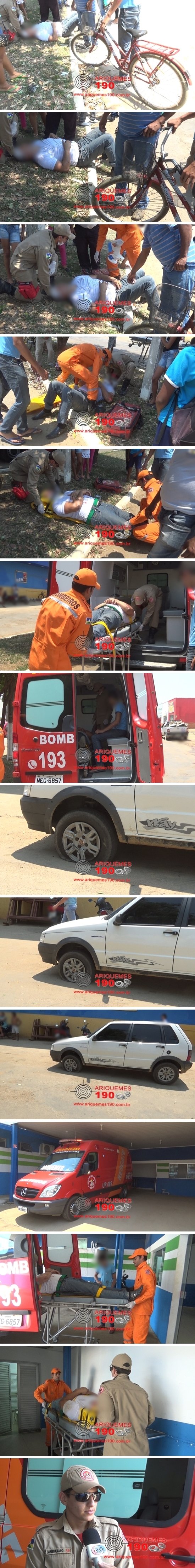 Por volta das 11h45min desta sexta-feira (09/09), o Corpo de Bombeiros foi acionado a comparecer na Avenida Guaporé do Setor 11 em Ariquemes para atender uma ocorrência de acidente de trânsito. De imediato os Bombeiros se deslocaram até ao local onde se depararam com um homem ferido deitado no canteiro. Imediatamente os Bombeiros prestaram os primeiros socorros à vítima, utilizando a técnica de imobilização. Em seguida a vítima foi encaminhada para o Hospital Regional de Ariquemes para receber atendimento médico especializado. Segundo informações levantadas no local, o homem transitava pela Avenida Guaporé com uma moto, quando em dado momento não percebeu que o condutor do carro da marca Fiat modelo Uno de cor branca estava saindo do estacionamento, momento em que houve a colisão lateral de ambos os veículos. Com o impacto da batida, o carro acabou furando o pneu e o motociclista veio sofrer uma queda juntamente com seu filho. Em entrevista concedida ao Canal 35 e Site Ariquemes 190 o Bombeiro Manganaro relatou que a vítima apresentava escoriações e uma suposta fratura no dedo, pois o mesmo já apresentava um problema antigo e com a queda agravou a situação, mas aparentemente o homem está bem. O filho do motociclista sofreu apenas escoriações.