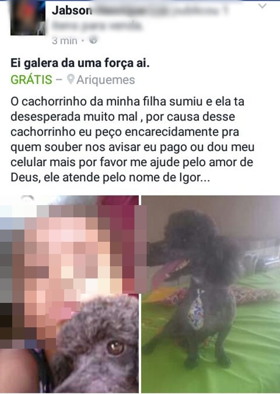 Uma criança está à procura de seu cachorrinho da raça poodle de cor preta que atende pelo nome de Igor desaparecido na Rua Fernando Pessoa do Bairro Bom Jesus. A criança está sentindo muita falta do animal e pede para quem encontra-lo entrar em contato com Jabá pelo telefone 9 9921-9556 ou 9 9337-0432 (Paula), que será recompensado.