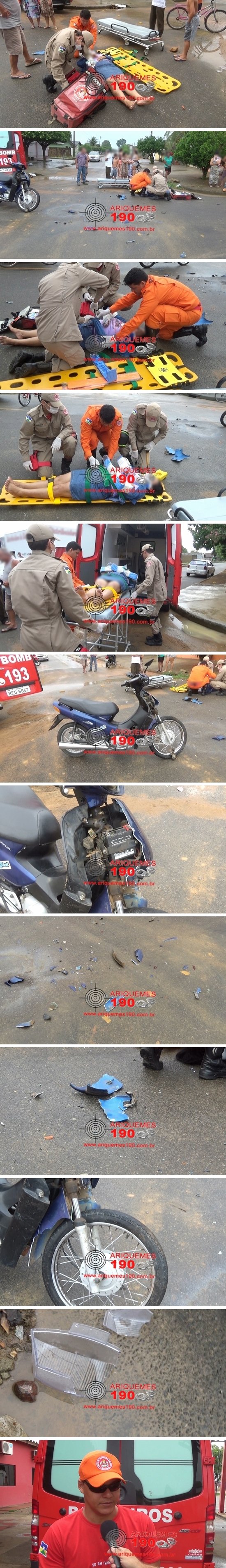 Por volta das 08h15min desta quarta-feira (21/09), o Corpo de Bombeiros foi acionado a comparecer na 6ª Rua do Setor 06 em Ariquemes, pois segundo informações havia acontecido um acidente de trânsito. De imediato os Bombeiros se deslocaram até ao local, onde se depararam com uma mulher caída ao solo. Imediatamente os Bombeiros prestaram os primeiros socorros à mulher, onde foi utilizado o colar cervical para imobilizar a coluna, as talas para imobilizar a mão e o braço e em seguida prancheando a mulher. Segundo informações levantadas no local, a condutora da motoneta da marca Honda modelo Biz de cor azul estava transitando pela via, momento em que acabou colindo na traseira de um carro. Com o impacto da batida, a mulher veio a sofrer uma queda. Após os primeiros socorros, a vítima foi encaminhada para o Hospital Regional de Ariquemes para receber atendimento médico especializado. Em entrevista concedida ao Canal 35 e Site Ariquemes 190 o Bombeiro Ivair relatou que a mulher sofreu várias escoriações na perna e fraturas na mão e braço.