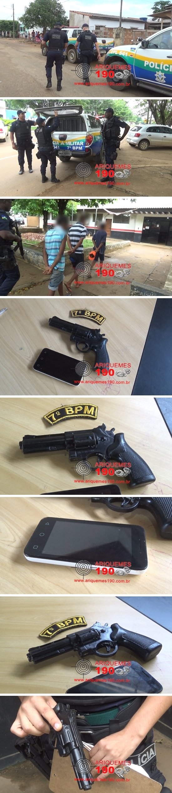 Por volta das 12 horas deste domingo (25/09), os Policiais Militares: Andrade, Moraes e Sandra estavam em patrulhamento pelo Setor 04, momento em que receberam a informação via Central de Operações de que havia acabado de acontecer um roubo a pessoa na 2ª Rua. Ao ser realizado buscas pelos infratores, os Militares tiveram êxito em localizá-los. No momento da abordagem e revista pessoal, os Policiais encontraram com os menores o celular da vítima e um simulacro tipo revólver de cor preta. Segundo a vítima, um adolescente de 13 anos, este informou que estava próximo a sua residência, quando percebeu os infratores se aproximando. Logo o garoto correu e durante o trajeto jogou seu celular ao solo, porém a vítima foi alcançada por um dos infratores que a agrediu com vários socos na cabeça. Após o ato infracional, os menores se evadiram do local rumo Setor 11. Diante dos fatos, os infratores receberam voz de apreensão e foram conduzidos para a 3ª Delegacia de Polícia Civil de Ariquemes especializada na Repressão aos Crimes Contra o Patrimônio onde foi registrado o Boletim de Ocorrência Policial (BOP) de n° 2690/2016, para as providências cabíveis.