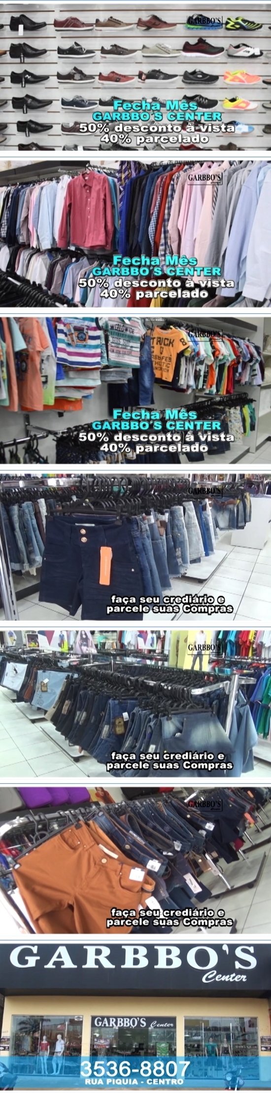 Venha correndo aproveitar o Fecha Mês que a Garbbo’s Center preparou para você. Todo o estoque da loja você vai encontrar com até 50% de desconto à vista ou 40% de desconto parcelado. Faça também seu crediário e parcele suas compras. Garbbo’s Center, vestindo você e toda a sua família. Na Rua Piquiá - Centro. Telefone: 3536-8807.