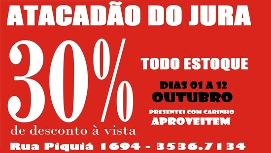 O Atacadão do Jura está com 30% de desconto à vista em todo o estoque de brinquedos, decorações, utilidades domésticas, caça, pesca e muito mais! Essa promoção foi prorrogada até dia 31 de outubro, CORRA! Ainda dá tempo de escolher o presente para o dia das crianças e ainda renovar a decoração de sua residência e muito mais. Atacadão do Jura. Localizado na Rua Piquiá, Centro. Telefone: 3536-7134.
