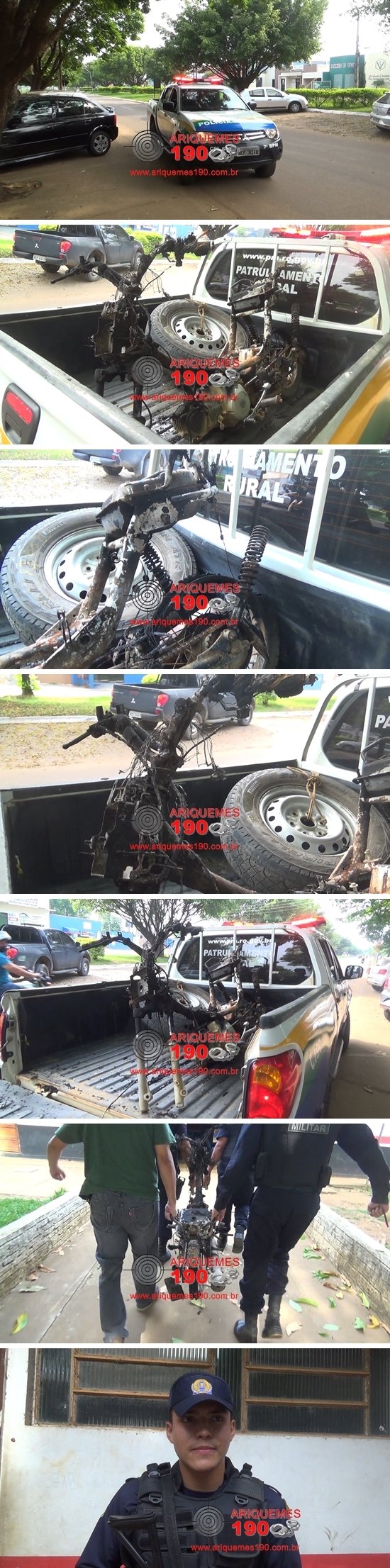 Por volta das 07h50min deste domingo (23/10), os Policiais Militares: Gago, Lucas e Anderson foram acionados a comparecer na Rua Theobroma no Setor Coqueiral em Ariquemes, pois segundo informações havia uma moto abandonada em um matagal. De imediato os Policiais se deslocaram até ao endereço citado, onde constataram a veracidade dos fatos ao se depararem com o veículo com placa NCP-3630 totalmente carbonizado. Diante dos fatos, a motoneta foi conduzida e apresentada na Delegacia Geral de Polícia Civil de Ariquemes onde foi registrado o Boletim de Ocorrência Policial (BOP) de n° 10614/2016, para as devidas providências que o caso requer.
