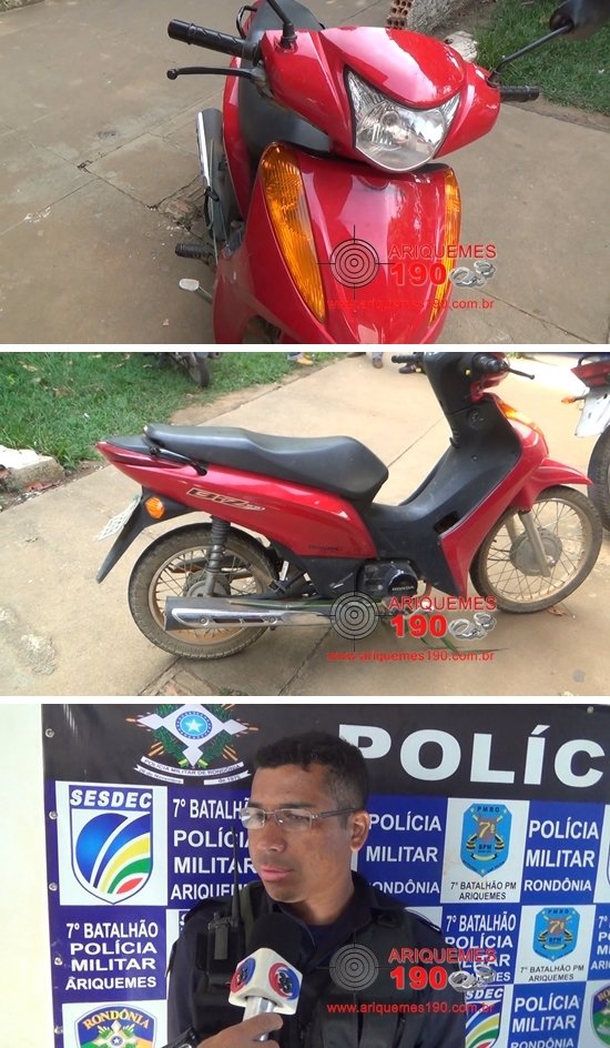 Por volta das 08 horas desta quarta-feira (26/10), os Policiais Militares da Patrulha Charlie: Antônio Marcos, Marcos Castro e Marcelo realizavam patrulhamento de rotina pelas ruas da cidade, quando foram informados através de uma informação anônima, que no interior do Parque Botânico, ao lado do Bairro Apoio Social, havia uma motoneta da marca Honda, modelo Biz 100 ES de cor vermelha, placa NCQ-2365/Ariquemes, abandonada no mato. A guarnição foi para o local indicado e encontrou a referida motoneta que apresentava restrição de roubo, conforme a ocorrência nº 2874/16, bem como avistaram um buraco no muro por onde a motoneta deve ter sido conduzida. Mediante os fatos a ocorrência nº 10687/16, foi registrada na Delegacia Geral, para ser restituída ao seu verdadeiro proprietário.