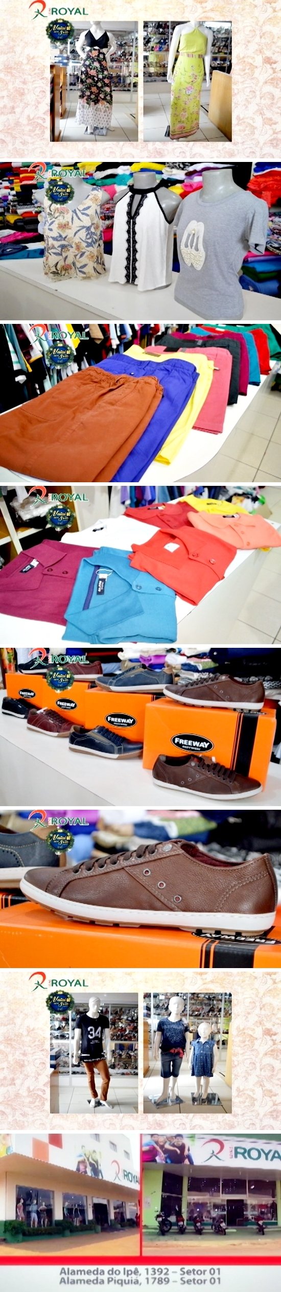 As Lojas Royal acabaram de receber muitas novidades, venha conferir! Para as mulheres a Lojas Royal oferece diversas inovações em vestidos e blusas. E para os homens as Lojas Royal estão com muitos modelos de bermudas, camisetas e sapatênis. No crediário você escolhe o melhor plano: 3 vezes para 30, 60 e 90 dias, 5 vezes para 30,60,90,120 e 150 dias ou 7 vezes direto. Lojas Royal, uma sempre perto de você. Localizadas na Alameda do Ipê, nº 1392 e Alameda Piquiá n º 1789, ambas no Setor 01.