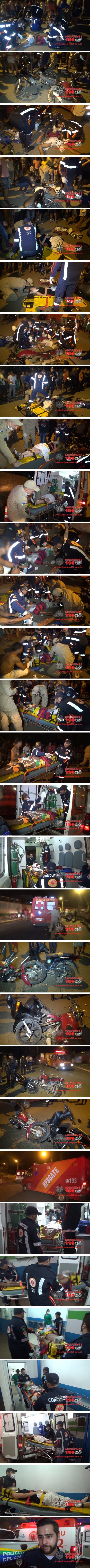 Por volta das 20h20m deste sábado 28/01, o condutor da motoneta da marca Honda, modelo Biz de cor preta trafegava pela Av. Perimetral Leste juntamente com uma moça de 23 anos que estava na garupa, quando o condutor de uma motocicleta da marca Honda, modelo Titan de cor vermelha colidiu transversalmente com a Biz. Devido ao forte impacto da colisão, as três vítimas caíram ao solo e sofreram escoriações. Conforme o Boletim de Ocorrência de Acidente de Trânsito (BOAT), sob n°38/2017, registrado pela Polícia Militar, o condutor da Titan estava em alta velocidade transitando em sentido contrário à motoneta, quando invadiu a pista em que transitava as outras vítimas, causando assim a colisão. As equipes de socorro do Serviço de Atendimento Móvel de Urgência (SAMU) e Corpo de Bombeiros foram acionadas, sendo que ali chegando os socorristas constataram que o condutor da Titan estava desacordado. Imediatamente os socorristas iniciaram os procedimentos de primeiros socorros, sendo que em dado momento o condutor que estava em estado mais grave acordou muito agitado atrapalhando assim o atendimento do SAMU. A moça que estava na garupa da Biz também recebeu atendimento pré-hospitalar pelos Bombeiros que a imobilizaram. O condutor da Biz sofreu apenas leves escoriações e foi conduzido ao Pronto Socorro do Hospital Regional de Ariquemes, juntamente com as outras duas vítimas, para ambas receberem atendimento médico especializado. Em entrevista ao Canal 35 para o Programa Bronca da Pesada, Rodrigo Mezzomo médico do SAMU relatou que o condutor da Titan provavelmente estava sob efeito de bebida alcoólica e pode ter sofrido uma fratura fechada no quadril. As outras vítimas não sofreram nenhuma fratura.