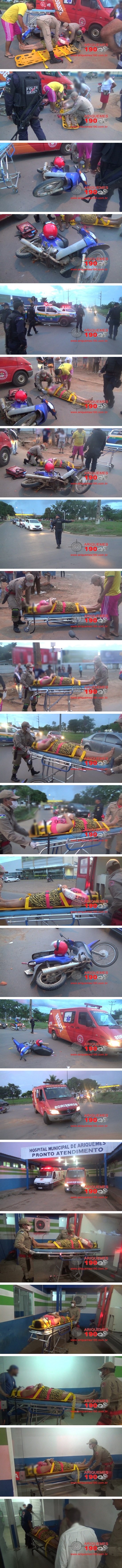 Por volta das 18h30m, desta quinta-feira 02/02, a guarnição da Polícia Militar foi acionada a comparecer na Avenida Capitão Sílvio no Setor de Grandes Áreas em Ariquemes, pois segundo informações, no local havia acontecido um acidente de trânsito. De imediato os PM’s fizeram o deslocamento, sendo que ali chegando se depararam com a guarnição do Corpo de Bombeiros prestando atendimento a uma mulher caída ao solo. Ao coletar os dados do que havia acontecido, os Militares foram informados que a condutora da caminhonete da marca Ford, modelo F-250 de cor preta seguia pela Travessa Marte, quando adentrou a Avenida Capitão Sílvio e acabou colidindo com a motoneta da marca Honda, modelo Biz de cor azul. A motociclista que sofreu várias escoriações foi imobilizada pelos Bombeiros, em seguida conduzida ao Pronto Socorro do Hospital Regional para receber atendimento médico especializado. O Boletim de Ocorrência de Acidente de Trânsito (BOAT), foi registrado na 1ª Delegacia Geral de Polícia Civil de Ariquemes, para a tomada das medidas que o caso requer. Em entrevista ao Canal 35, o Bombeiro Amoan relatou que a vítima sofreu uma luxação no pulso esquerdo.