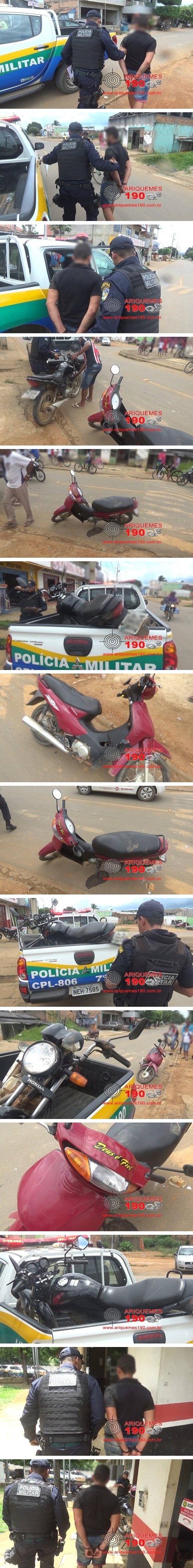 No final da manhã desta quinta-feira 16/02, por volta das 11h20m, a guarnição da Polícia Militar composta pelo Aspirante a Oficial Alves e Soldado Madeira, realizava patrulhamento pelo Setor 08 de Ariquemes, quando na Rua Vimbere, os Militares avistaram um elemento suspeito em uma motocicleta da marca Honda, modelo Fan de cor preta. Ao receber ordem de parada, o motociclista empreendeu fuga em alta velocidade colocando em risco a integridade física das pessoas que transitavam nas proximidades. Em dado momento, o motociclista perdeu o controle da direção da moto e acabou colidindo frontalmente com uma motoneta da marca Honda, modelo Biz. Com a queda, o elemento foi detido e imobilizado pelos PM’s. A passageira da Biz sofreu uma pequena escoriação. Ao realizar a consulta veicular, os Militares constataram que a motocicleta conduzida pelo elemento era produto de roubo. Mediante os fatos, o elemento e a motocicleta, foram conduzidos à 3ª Delegacia de Polícia Civil de Ariquemes, onde foi registrado o Boletim de Ocorrência Policial (BOP), sob n°261/2017, para que sejam tomadas as providências que o caso requer.