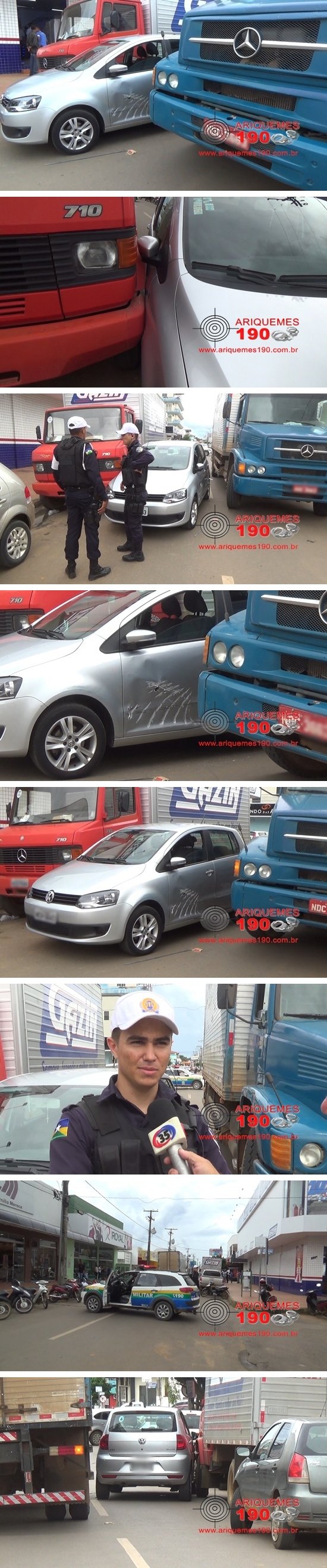 Por volta das 15h30min desta quarta-feira (21/02), o condutor de um veículo da marca Volkswagen, modelo Fox de cor prata, com placas de Ariquemes, descia a Rua Piquiá, que é de mão única, quando nas proximidades da Travessa Maracatiara um caminhão baú com placas de Jaru-RO, que estava estacionado no lado esquerdo da via, saiu e abalroou o veículo na altura da porta do motorista que foi abalroado também por um caminhão baú que estava estacionado no lado direito da via em frente a uma loja de eletrodomésticos. O carro acabou ficando imprensado entre os dois caminhões que praticamente nada de danos sofreram. Com o impacto o condutor do carro passou mal e foi atendido por populares dentro da loja de eletrodomésticos. Os Policiais Militares da PTran: De Alencar, Renato Silva e Gladstone de imediato chegaram ao local e fecharam a via para a retirada dos veículos. A guarnição após coleta de dados liberou os caminhões e o carro para seus respectivos condutores que estavam com a documentação obrigatória em dia.