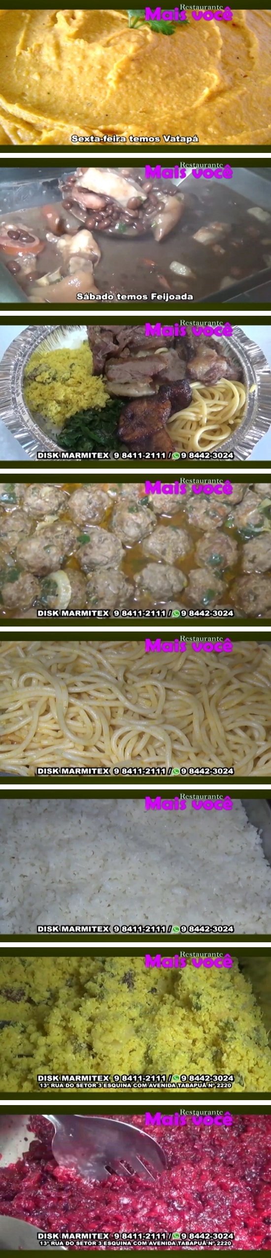 O Restaurante Mais Você te oferece uma deliciosa comida caseira, com muitas variedades e carne assada todos os dias. Aqui você encontra maionese, saladas, refogados, carne ao molho, batata frita, filé de peixe, filé de frango e muito mais. Sucos e Refrigerantes em geral. Na sexta-feira temos vatapá e no sábado aquela feijoada. Contamos com disk marmitex 9 8411-2111 ou 9 8442 3024 (WhatsApp). Horário de atendimento das 10h30m às 14h00m. Aceitamos cartão de débito. Restaurante Mais Você! 11ª Rua do Setor 03, esquina com Avenida Tabapuã nº 2220.
